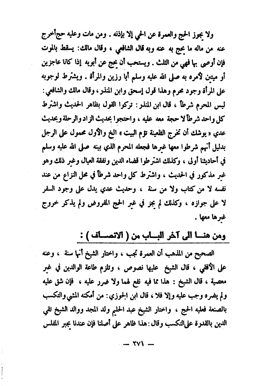 الصحيح من المذهب: أن العمرة تجب، واختار الشيخ أنها سنة، وعنه: على الأفقي، قال الشيخ: عليها نصوص. وتلزم طاعة الوالدين في غير معصية، قال الشيخ: هذا مما فيه نفع لهما ولا ضرر عليه، فإن شق عليه ولم يضره وجب عليه وإلا فلا. قال ابن الجوزي: من أمكنه المشي والتكسب بالصنعة فعليه الحج، واختار الشيخ عبد الحليم ولد المجد ووالد الشيخ تقي الدين بالقدرة على التكسب، وقال: هذا ظاهر على أصلنا، فإن عندنا: يجبر المفلس