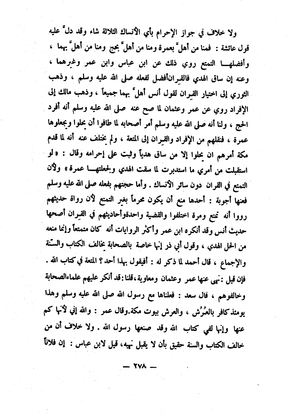 فإن قيل: "نهى عنها عمر وعثمان ومعاوية"، قلنا: قد أنكر عليهم علماء الصحابة وخالفوهم، قال سعد: "فعلناها مع رسول الله صلى الله عليه وسلم وهذا يومئذ كافر بالعُرُش"، والعرش بيوت مكة. وقال عمر: "والله إني لأنهاكم عنها، وإنها لفي كتاب الله، وقد صنعها رسول الله"، ولا خلاف أن من خالف الكتاب والسنة حقيق بأن لا يقبل نهيه. قيل لابن عباس: إن فلاناً