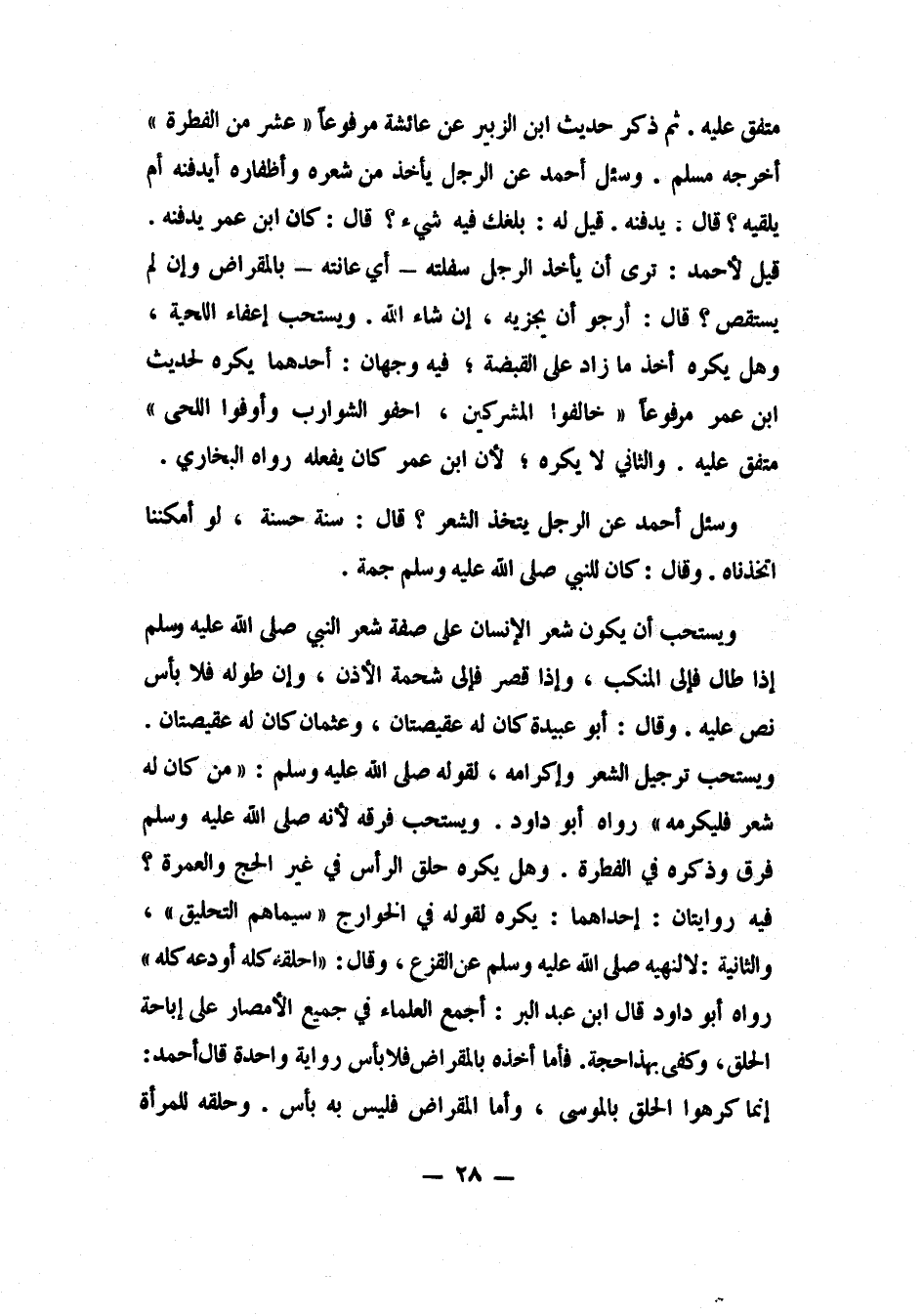 ويستحب إعفاء اللحية، وهل يكره أخذ ما زاد على القبضة; فيه وجهان: أحدهما: يكره، لحديث ابن عمر، مرفوعاً: "خالفوا المشركين، احفو الشوارب وأوفوا اللحى". 2 متفق عليه. والثاني: "لا يكره، لأن ابن عمر كان يفعله"، رواه البخاري.