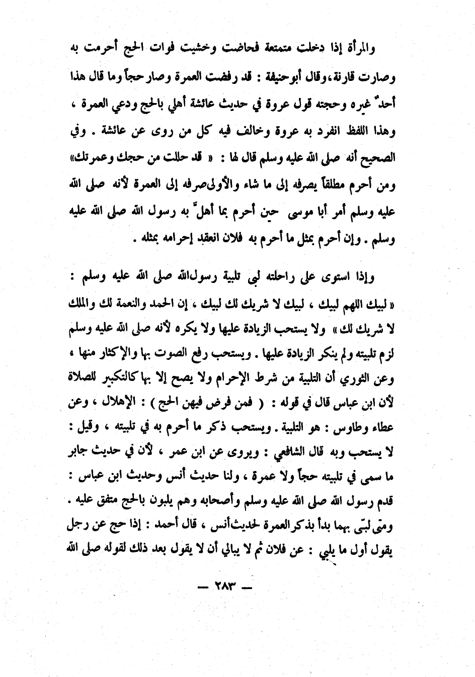 وإذا استوى على راحلته لبى تلبية رسول الله صلى الله عليه وسلم: "لبيك اللهم لبيك. لبيك لا شريك لك لبيك. إن الحمد والنعمة لك والملك. لا شريك لك ". 3 ولا يستحب الزيادة عليها ولا يكره، "لأنه صلى الله عليه وسلم لزم تلبيته ولم ينكر الزيادة عليها".