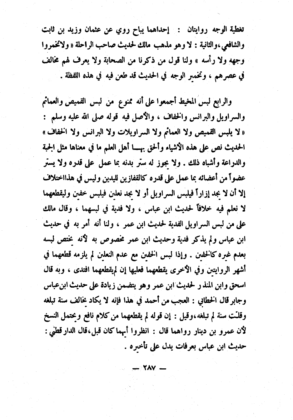 وإذا لبس الخفين مع عدم النعلين، لم يلزمه قطعهما في أشهر الروايتين، وفي الأخرى يقطعهما؛ فعليها، "إن لم يقطعهما افتدى"؛ وبه قال إسحاق وابن المنذر، لحديث ابن عمر، وهو يتضمن زيادة على حديث ابن عباس وجابر. قال الخطابي: العجب من أحمد في هذا، فإنه لا يكاد يخالف سنة تبلغه، وقلّت سنة لم تبلغه! وقيل: إن قوله: لم يقطعهما، من كلام نافع، ويحتمل النسخ، لأن عمرو بن دينار رواهما قال: انظروا أيهما كان قبل. قال الدارقطني: حديث ابن عباس بعرفات يدل على تأخيره.