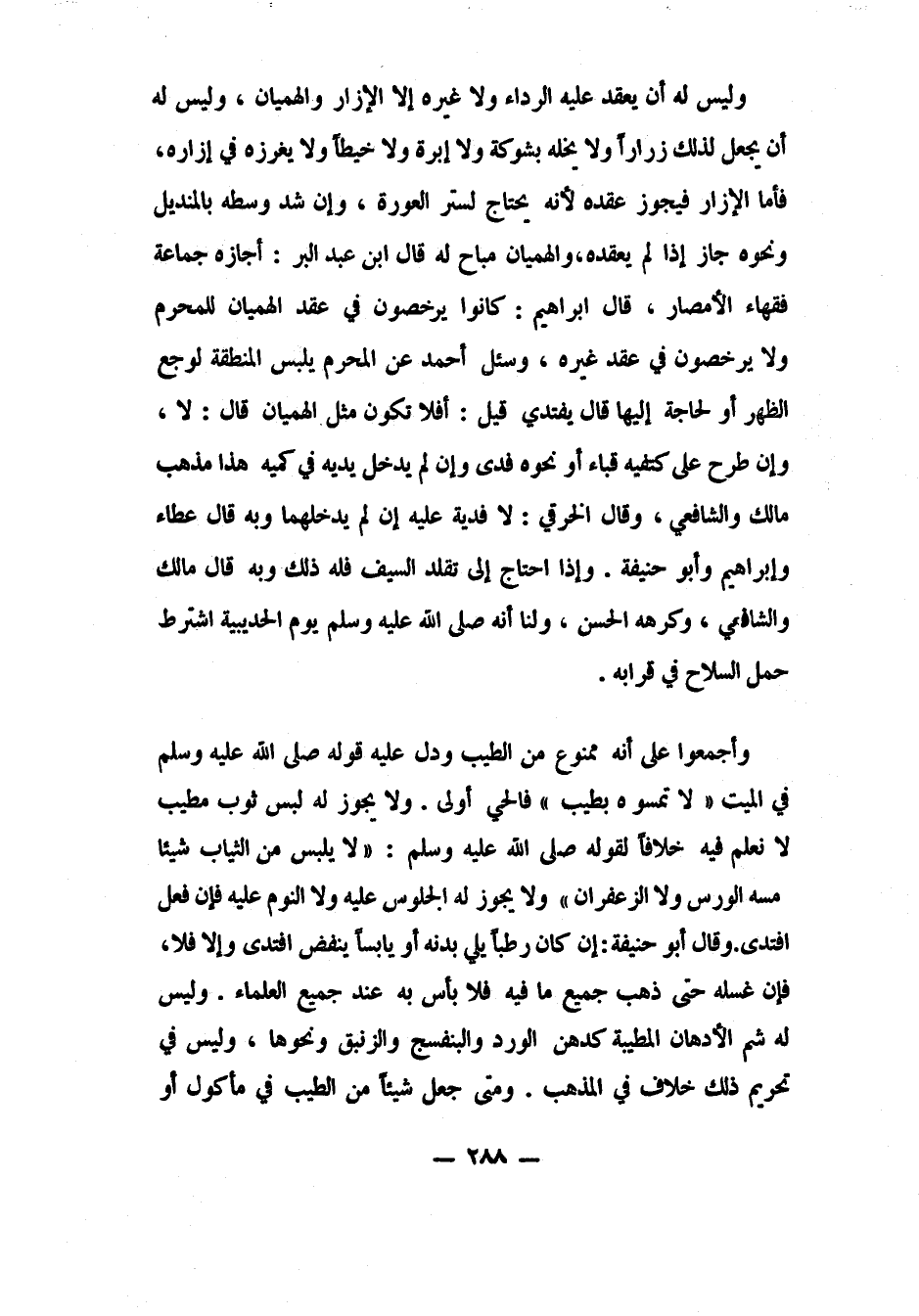 وليس له أن يعقد عليه الرداء ولا غيره، إلا الإزار والهميان. وليس له أن يجعل لذلك زراراً ولا يخله بشوكة ولا إبرة ولا خيطة، ولا يغرزه في إزاره. فأما الإزار فيجوز عقده، لأنه يحتاج لستر العورة. وإن شد وسطه بالمنديل ونحوه، جاز إذا لم يعقده. والهميان مباح له، قال ابن عبد البر: أجازه جماعة فقهاء الأمصار. قال إبراهيم: كانوا يرخصون في عقد الهميان للمحرم، ولا يرخصون في عقد غيره. وسئل أحمد: عن المحرم يلبس المنطقة لوجع الظهر أو لحاجة إليها؟ قال: يفتدي. قيل: أفلا تكون مثل الهميان؟ قال: لا. وإن طرح على كتفيه قباء أو نحوه فدى، وإن لم يدخل يديه في كميه، هذا مذهب مالك والشافعي. وقال الخرقي: لا فدية عليه إن لم يدخلهما، وبه قال عطاء وإبراهيم وأبو حنيفة. وإذا احتاج إلى تقلد السيف فله ذلك، وبه قال مالك والشافعي، وكرهه الحسن. ولنا: "أنه صلى الله عليه وسلم يوم الحديبية اشترط حمل السلاح في قرابه".