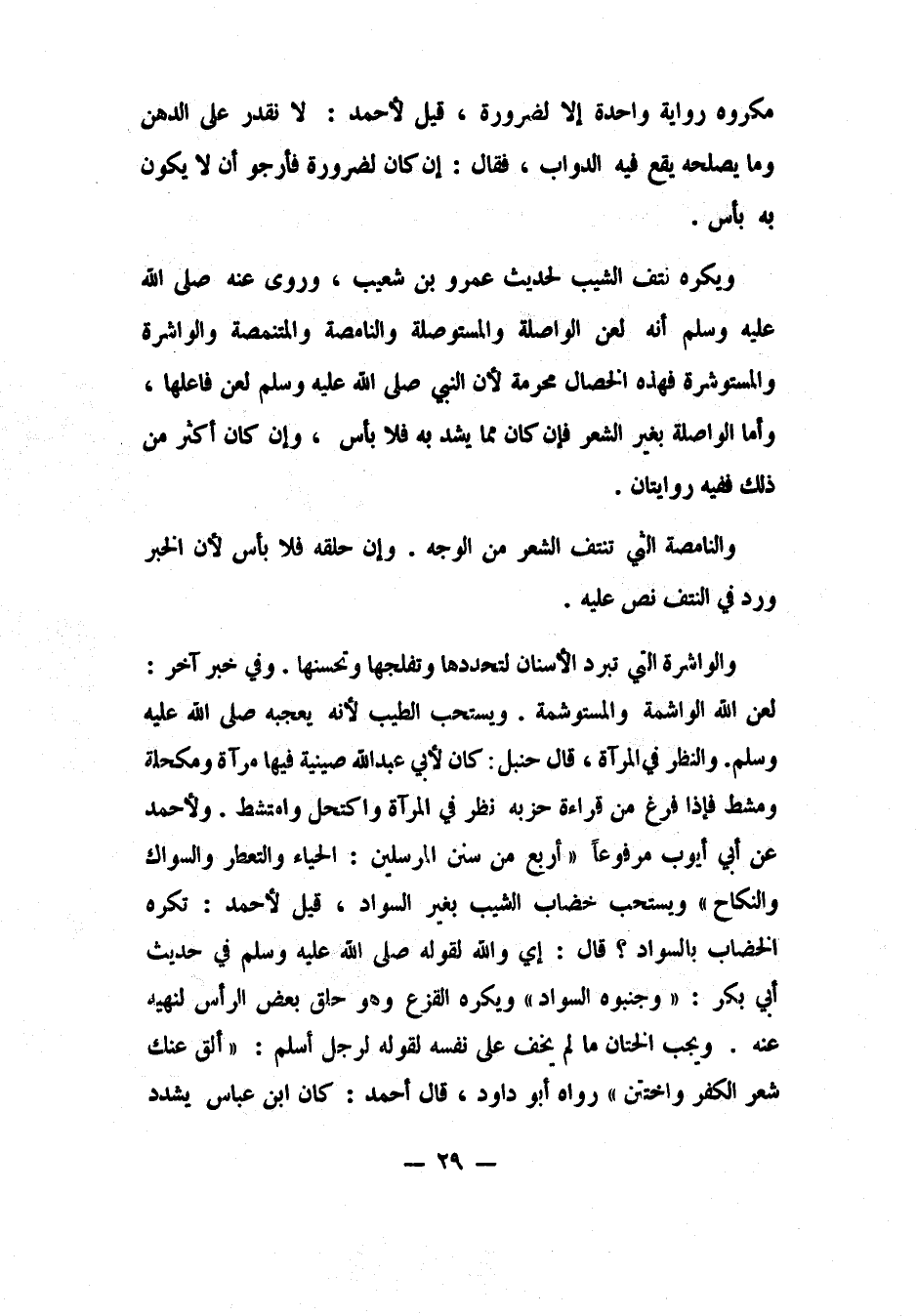 والنظر في المرآة، قال حنبل: كان لأبي عبد الله صينية فيها مرآة ومكحلة ومشط، فإذا فرغ من قراءة حزبه نظر في المرآة واكتحل وامتشط. ولأحمد عن أبي أيوب، مرفوعا: ً "أربع من سنن المرسلين: الحياء والتعطر والسواك والنكاح" 2.