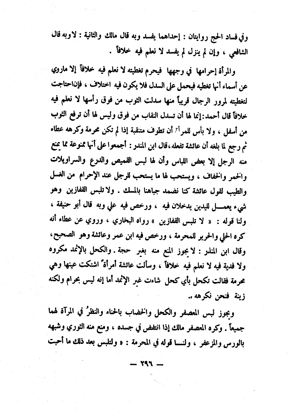 والمرأة إحرامها في وجهها؛ فيحرم تغطيته، لا نعلم فيه خلافاً، إلا ما روي عن أسماء أنها تغطيه، فيحمل على السدل، فلا يكون فيه اختلاف. فإن احتاجت لتغطيته لمرور الرجال قريباً منها، سدلت الثوب من فوق رأسها، لا نعلم فيه خلافاً. قال أحمد: إنما لها أن تسدل النقاب من فوق، وليس لها أن ترفع الثوب من أسفل. ولا بأس للمرأة أن تطوف متنقبة إذا لم تكن محرمة، وكرهه عطاء، ثم رجع لما بلغه أن عائشة تفعله. قال ابن المنذر: أجمعوا على أنها ممنوعة مما يمنع منه الرجل إلا بعض اللباس، وأن لها لبس القميص والدرع والسراويلات والخمر والخفاف. ويستحب لها ما يستحب للرجل عند الإحرام من الغسل والطيب، لقول عائشة: "كنا نضمد جباهنا بالمسك". ولا تلبس القفازين، وهو شيء يعمل لليدين يدخلان فيه، ورخص فيه علي، وبه قال أبو حنيفة. ولنا: قوله: "لا تلبس القفازين". 1 رواه البخاري. وروي عن عطاء أنه كره الحلي والحرير للمحرمة، و"رخص فيه ابن عمر وعائشة"، وهو الصحيح. وقال ابن المنذر: لا يجوز المنع منه بغير حجة.