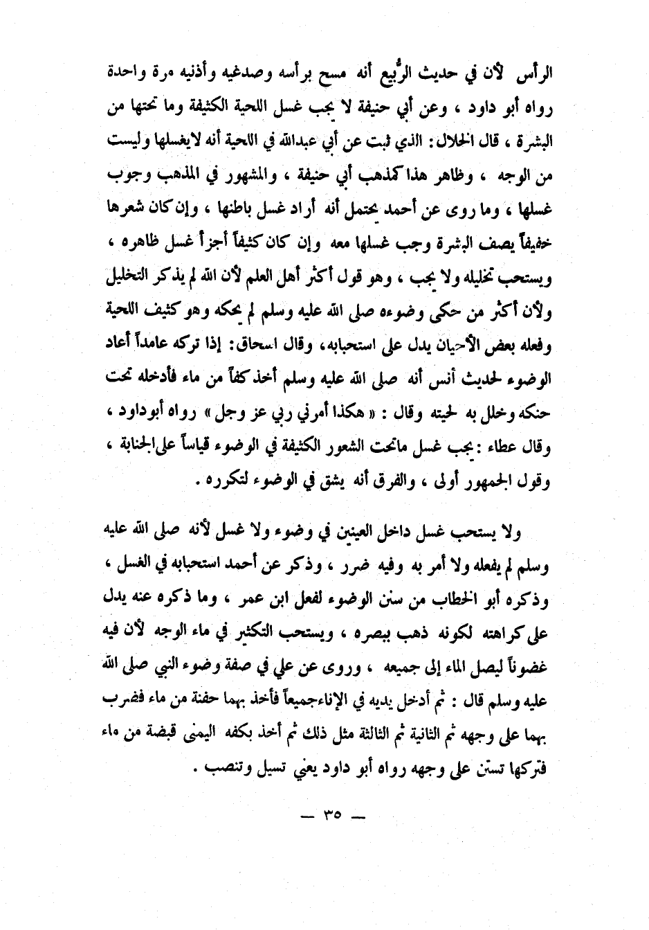 وعن أبي حنيفة: لا يجب غسل اللحية الكثيفة وما تحتها من البشرة، قال الخلال: الذي ثبت عن أبي عبد الله في اللحية: أنه لا يغسلها، وليست من الوجه؛ وظاهر هذا كمذهب أبي حنيفة، والمشهور في المذهب: وجوب غسلها، وما روي عن أحمد يحتمل أنه أراد غسل باطنها. وإن كان شعرها خفيفاً يصف البشرة وجب غسلها معه، وإن كان كثيفاً أجزأ غسل ظاهره، ويستحب تخليله ولا يجب؛ وهو قول أكثر أهل العلم، لأن الله لم يذكر التخليل، ولأن أكثر من حكى وضوءه صلى الله عليه وسلم لم يحكه، وهو كثيف اللحية؛ وفعله بعض الأحيان يدل على استحبابه. وقال إسحاق: إذا تركه عامداً أعاد الوضوء، لحديث أنس: "أنه صلى الله عليه وسلم أخذ كفاً من ماء فأدخله تحت حنكه وخلل به لحيته، وقال: هكذا أمرني ربي عز وجل". 2 رواه أبو داود. وقال عطاء: يجب غسل ما تحت الشعور الكثيفة في الوضوء، قياساً على الجنابة، وقول الجمهور أولى، والفرْق أنه يشق في الوضوء لتكرره.