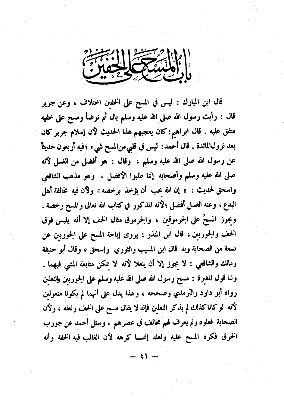 قال ابن المبارك: ليس في المسح على الخفين اختلاف، وعن جرير قال: "رأيت رسول الله صلى الله عليه وسلم بال، ثم توضأ ومسح على خفيه". 1 متفق عليه.