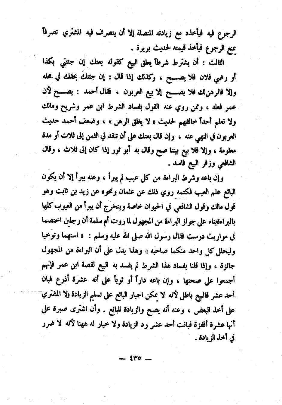 وإن باعه وشرط البراءة من كل عيب، لم يبرأ، وعنه: "يبرأ إلا أن يكون البائع علم العيب فكتمه"، روي ذلك عن عثمان، ونحوه عن زيد بن ثابت؛ وهو قول مالك، وقول الشافعي في الحيوان خاصة؛ ويتخرج أن يبرأ من العيوب كلها بالبراءة بناء على جواز البراءة من المجهول، لما روت أم سلمة: "أن رجلين اختصما في مواريث درست، فقال رسول الله صلى الله عليه وسلم: استهما وتوخّيا، وليحلّل كل واحد منكما صاحبه "، وهذا يدل على أن البراءة من المجهول جائزة. وإذا قلنا بفساد هذا الشرط، لم يفسد به البيع، لقصة ابن عمر فإنهم أجمعوا على صحتها. وإن باعه داراً أو ثوباً على أنه عشرة أذرع، فبان أحد عشر، فالبيع باطل، لأنه لا يمكن إجبار البائع على تسليم الزيادة، ولا المشتري على أخذ البعض. وعنه: أنه يصح، والزيادة للبائع. وإن اشترى صبرة على أنها عشرة أقفزة، فبانت أحد عشر، رد الزيادة، ولا خيار له ههنا، لأنه لا ضرر في أخذ الزيادة.