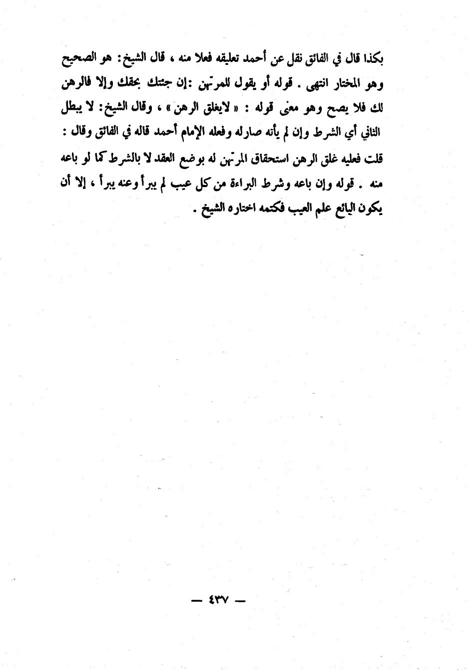 بكذا، قال في الفائق: نقل عن أحمد تعليقه فعلاً منه، قال الشيخ: هو الصحيح، وهو المختار. انتهى. قوله: أو يقول للمرتهن: إن جئتك بحقك وإلا فالرهن لك، فلا يصح، وهو معنى قوله: "لا يغلق الرهن". 1 وقال الشيخ: لا يبطل الثاني أي: الشرط، وإن لم يأته صار له، وفعله الإمام أحمد، قاله في الفائق. وقال: قلت: فعليه غلق الرهن، استحقاق المرتهن له بوضع العقد لا بالشرط، كما لو باعه منه. قوله: وإن باعه وشرط البراءة من كل عيب، لم يبرأ، وعنه: يبرأ، إلا أن يكون البائع علم العيب فكتمه، اختاره الشيخ.
