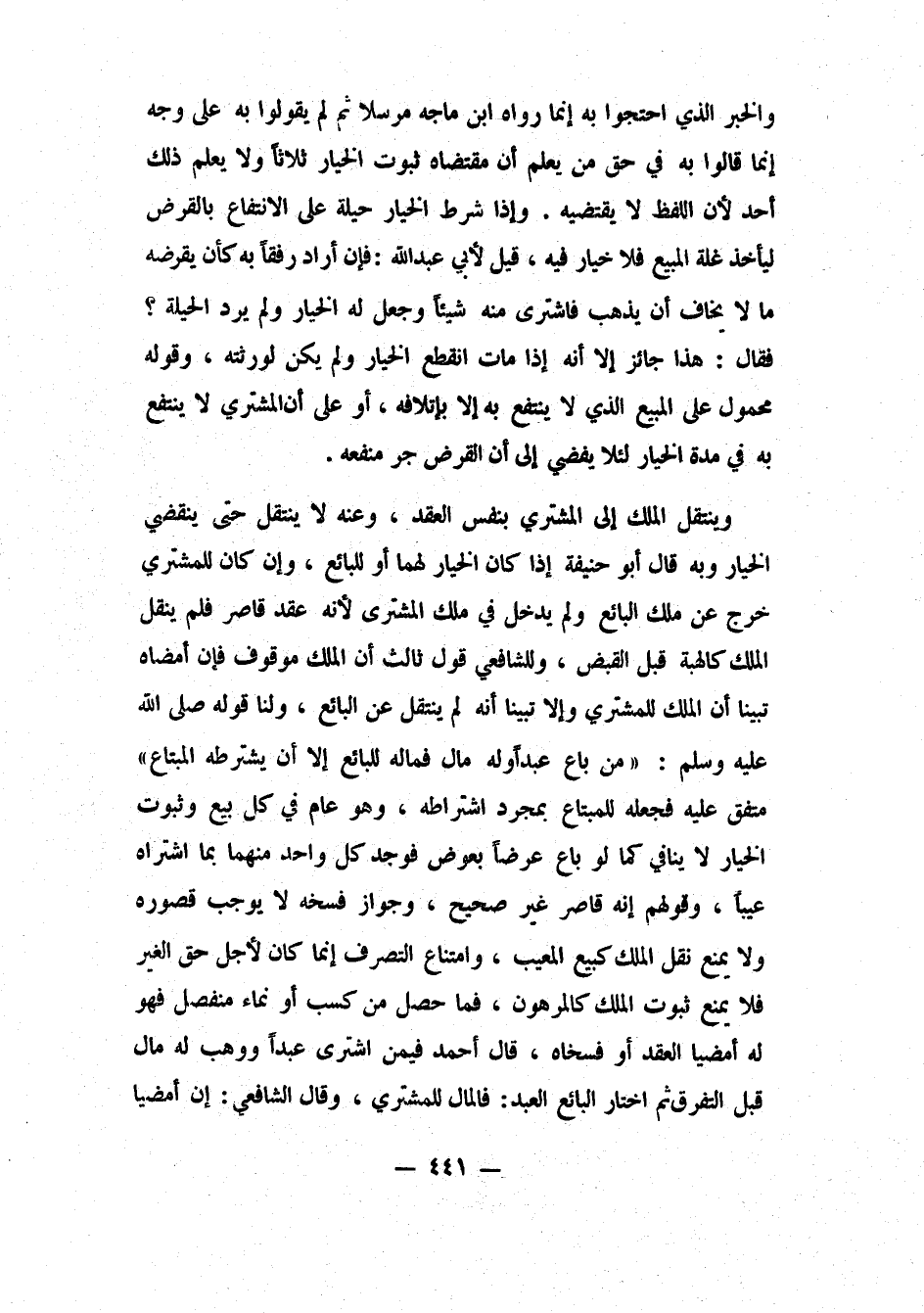 والخبر الذي احتجوا به إنما رواه ابن ماجة مرسلاً، ثم لم يقولوا به على وجه، إنما قالوا به في حق من يعلم أن مقتضاه ثبوت الخيار ثلاثاً، ولا يعلم ذلك أحد، لأن اللفظ لا يقتضيه.