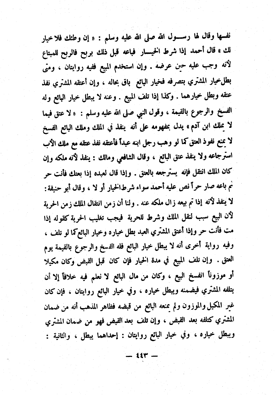 وإن استخدم المبيع، ففيه روايتان، ومتى بطل خيار المشتري بتصرفه، فخيار البائع باق بحاله. وإن أعتقه المشتري نفذ عتقه، وبطل خيارهما. وكذا إذا تلف المبيع. وعنه: لا يبطل خيار البائع، وله الفسخ والرجوع بالقيمة، وقول النبي صلى الله عليه وسلم: "لا عتق فيما لا يملك ابن آدم" 1 يدل بمفهومه على أنه ينفذ في الملك، وملك البائع الفسخ، لا يمنع نفوذ العتق، كما لو وهب رجل ابنه عبداً فأعتقه، نفذ عتقه مع ملك الأب استرجاعه، ولا ينفذ عتق البائع. وقال الشافعي ومالك: ينفذ، لأنه ملكه، وإن كان الملك انتقل، فإنه يسترجعه بالعتق.