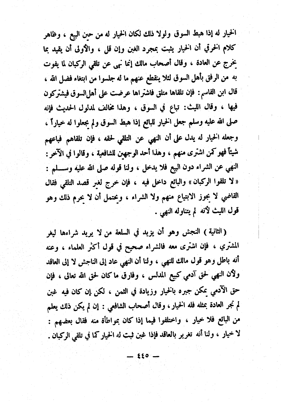 الخيار له إذا هبط السوق، ولولا ذلك لكان الخيار له من حين البيع. وظاهر كلام الخرقي: أن الخيار يثبت بمجرد الغبن، وإن قل، والأولى أن يقيد بما يخرج عن العادة. وقال أصحاب مالك: إنما نهى عن تلقي الركبان، لما يفوت به من الرفق بأهل السوق، لئلا ينقطع عنهم ما له جلسوا من ابتغاء فضل الله. قال ابن القاسم: فإن تلقاها متلقٍ فاشتراها، عرضت على أهل السوق فيشتركون فيها. وقال الليث: تباع في السوق؛ وهذا مخالف لمدلول الحديث، فـ"إنه صلى الله عليه وسلم جعل الخيار للبائع إذا هبط السوق"، ولم يجعلوا له خياراً، وجعْله الخيار له يدل على أن النهي عن التلقي لحقه. فإن تلقاهم فباعهم شيئاً فهو كمن اشترى منهم. وهذا أحد الوجهين للشافعية. وقالوا في الآخر: النهي عن الشراء دون البيع فلا يدخل. ولنا: قوله صلى الله عليه وسلم: " لا تلقوا الركبان"، 1 والبائع داخل فيه. فإن خرج لغير قصد التلقي، فقال القاضي: لا يجوز الابتياع منهم ولا الشراء، ويحتمل أن لا يحرم ذلك، وهو قول الليث، لأنه لم يتناوله النهي.