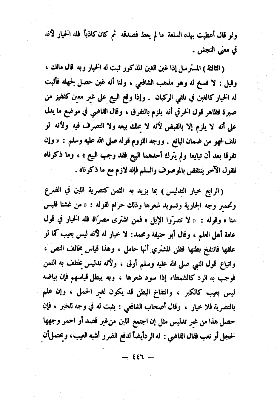 (الرابع: خيار التدليس) بما يزيد به الثمن، كتصرية اللبن في الضرع، وتحمير وجه الجارية، وتسويد شعرها، وذلك حرام، لقوله: "مَن غشنا فليس منا"، 2 وقوله: " لا تصرّوا الإبل". 3 فمن اشترى مصرّاة فله الخيار، في قول عامة أهل العلم. وقال أبو حنيفة ومحمد: لا خيار له، لأنه ليس بعيب، كما لو علفها فانتفخ بطنها فظن المشتري أنها حامل؛ وهذا قياس يخالف النص، واتباع قول النبي صلى الله عليه وسلم أولى، ولأنه تدليس يختلف به الثمن، فوجب به الرد، كالشمطاء إذا سوّد شعرها؛ وبه يبطل قياسهم، فإن بياضه ليس بعيب كالكبر، وانتفاخ البطن قد يكون لغير الحمل. وإن علم بالتصرية، فلا خيار.