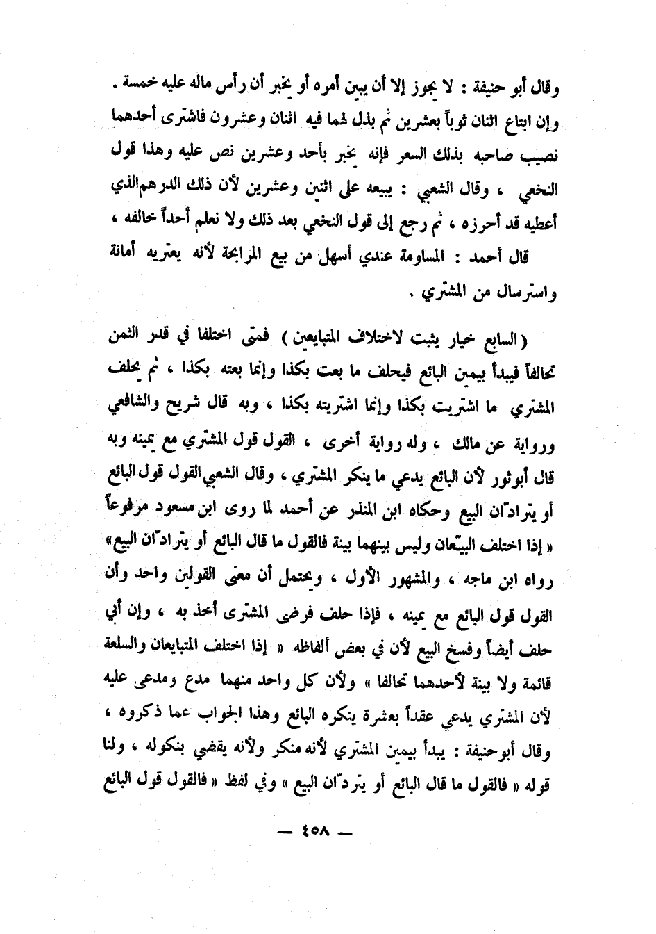 (السابع: خيار يثبت لاختلاف المتبايعين) . فمتى اختلفا في قدر الثمن تحالفا، فيبدأ بيمين البائع فيحلف: ما بعت بكذا، وإنما بعته بكذا. ثم يحلف المشتري: ما اشتريت بكذا، وإنما اشتريته بكذا؛ وبه قال شريح والشافعي ورواية عن مالك، وله رواية أخرى: القول قول المشتري مع يمينه، وبه قال أبو ثور، لأن البائع يدعي ما ينكر المشتري. وقال الشعبي: القول قول البائع أو يترادّان البيع، وحكاه ابن المنذر عن أحمد، لما روى ابن مسعود، مرفوعاً: "إذا اختلف البيّعان وليس بينهما بينة، فالقول ما قال البائع، أو يترادان البيع". 1 رواه ابن ماجة؛ والمشهور الأول. ويحتمل أن معنى القولين واحد، وأن القول قول البائع مع يمينه. فإذا حلف فرضي المشتري، أخذ به. وإن أبى حلف أيضاً، وفسخ البيع، لأن في بعض ألفاظه: "إذا اختلف المتبايعان والسلعة قائمة، ولا بينة لأحدهما، تحالفا"، ولأن كل واحد منهما مدعٍ ومدعَى عليه، لأن المشتري يدعي عقداً بعشرة ينكره البائع، وهذا الجواب عما ذكروه. وقال أبو حنيفة: يبدأ بيمين المشتري، لأنه منكر، ولأنه يقضي بنكوله. ولنا: قوله: "فالقول ما قال البائع، أو يترادّان البيع"، 2 وفي لفظ: "فالقول قول البائع،