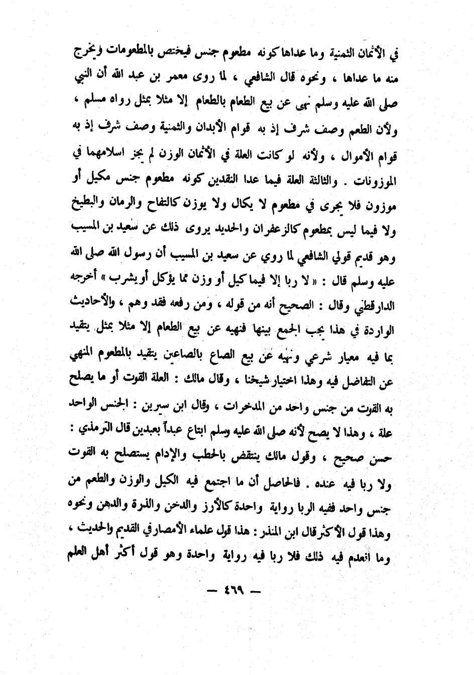 والثالثة: العلة فيما عدا النقدين: كونه مطعوم جنس مكيل أو موزون، فلا يجرى في مطعوم لا يكال ولا يوزن، كالتفاح والرمان والبطيخ، ولا فيما ليس بمطعوم، كالزعفران والحديد؛ يروى ذلك عن سعيد بن المسيب، وهو قديم قولي الشافعي، لما روي عن سعيد بن المسيب أن رسول الله صلى الله عليه وسلم قال: "لا ربا إلا فيما كِيل أو وُزن، مما يؤكل أو يشرب". أخرجه الدارقطني وقال: الصحيح أنه من قوله، ومَن رفعه فقد وهم. والأحاديث الواردة في هذا يجب الجمع بينها، فنهيه عن بيع الطعام إلا مثلاً بمثل يتقيد بما فيه معيار شرعي، ونهيه عن بيع الصاع بالصاعين يتقيد بالمطعوم المنهي عن التفاضل فيه، وهذا اختيار شيخنا. وقال مالك: العلة: القوت أو ما يصلح به القوت من جنس واحد من المدّخرات. وقال ابن سيرين: الجنس الواحد علة، وهذا لا يصح "لأنه صلى الله عليه وسلم ابتاع عبداً بعبدين". 1 قال الترمذي: حسن صحيح. وقول مالك ينتقض بالحطب والإدام يستصلح به القوت، ولا ربا فيه عنده.