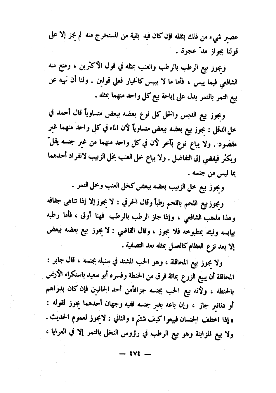 ويجوز بيع اللحم باللحم رطباً، وقال الخرقي: لا يجوز إلا إذا تناهى جفافه؛ وهذا مذهب الشافعي. وإذا جاز الرطب بالرطب، فهنا أولى، فأما رطبه بيابسه، ونيئه بمطبوخه، فلا يجوز. وقال القاضي: لا يجوز بيع بعضه ببعض إلا بعد نزع العظام، كالعسل بمثله بعد التصفية.