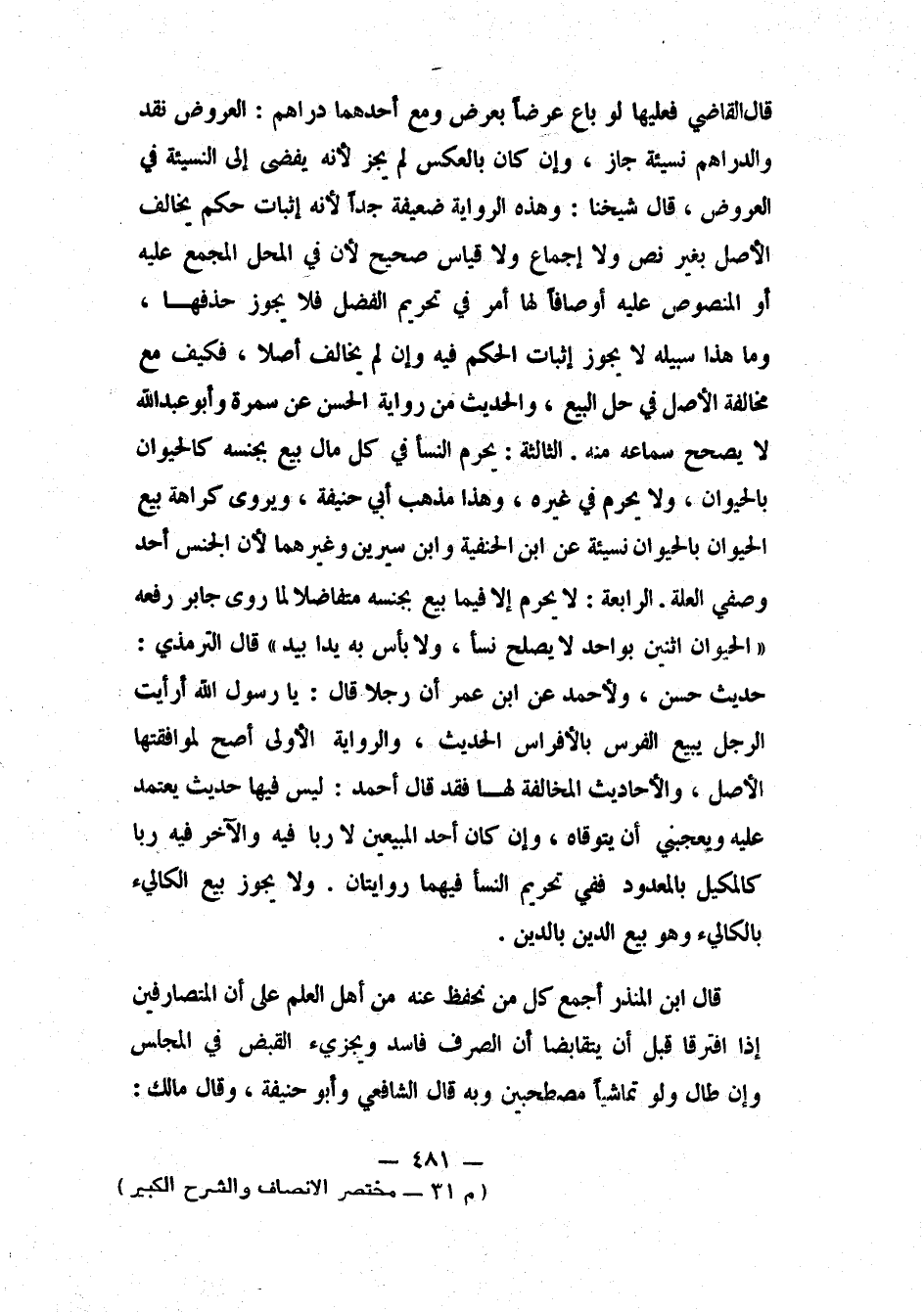الرابعة: لا يحرم إلا فيما بيع بجنسه متفاضلاً، لما روى جابر، رفعه: " الحيوان اثنين بواحد لا يصلح نسأ، ولا بأس به يداً بيد"، 1 قال الترمذي: حديث حسن، ولأحمد عن ابن عمر: "أن رجلاً قال: يا رسول الله، أرأيت الرجل يبيع الفرس بالأفراس؟ " 2 الحديث، والرواية الأولى أصح لموافقتها الأصل، والأحاديث المخالفة لها فقد قال أحمد: ليس فيها حديث يعتمد عليه، ويعجبني أن يتوقاه. وإن كان أحد المبيعين لا ربا فيه والآخر فيه ربا، كالمكيل بالمعدود، ففي تحريم النسإ فيهما روايتان.