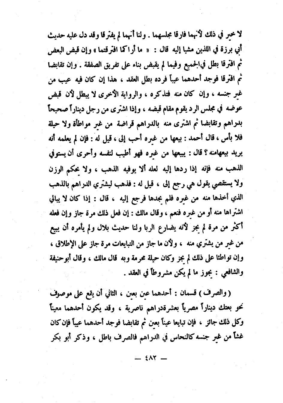 لا خير في ذلك، لأنهما فارقا مجلسهما. ولنا: أنهما لم يفترقا، وقد دل عليه حديث أبي برزة في اللذيْن مشيا إليه قال: "ما أراكما افترقتما". وإن قبض البعض ثم افترقا، بطل في الجميع، وفيما لم يقبض، بناء على تفريق الصفقة. وإن تقابضا ثم افترقا، فوجد أحدهما عيباً فردّه، بطل العقد؛ هذا إن كان فيه عيب من غير جنسه، وإن كان منه، فتذكره. والرواية الأخرى: لا يبطل، لأن قبض عوضه في مجلس الرد يقوم مقام قبضه. وإذا اشترى من رجل ديناراً صحيحاً بدراهم وتقابضا، ثم اشترى منه بالدراهم قراضة من غير مواطأة ولا حيلة، فلا بأس. قال أحمد: بيعها من غيره أحب إلي. قيل له: فإن لم يعلمه أنه يريد بيعها منه؟ قال: يبيعها من غيره، فهو أطيب لنفسه، وأحرى أن يستوفي الذهب منه، فإنه إذا ردها إليه لعله ألا يوفيه الذهب. ولا يحكم الوزن ولا يستقصي، يقول: هي رجع إلي. قيل له: فذهب ليشتري الدراهم بالذهب الذي أخذها منه من غيره، فلم يجدها فرجع إليه. قال: إذا كان لا يبالي اشتراها منه أو من غيره، فنعم. وقال مالك: إن فعل ذلك مرة جاز، وإن فعله أكثر من مرة لم يجز، لأنه يضارع الربا. ولنا: حديث بلال، ولم يأمره أن يبيع من غير من يشتري منه، ولأن ما جاز من التبايعات مرة جاز على الإطلاق. وإن تواطآ على ذلك لم يجز، وكان حيلة محرمة، وبه قال مالك. وقال أبو حنيفة والشافعي: يجوز ما لم يكن مشروطاً في العقد.
