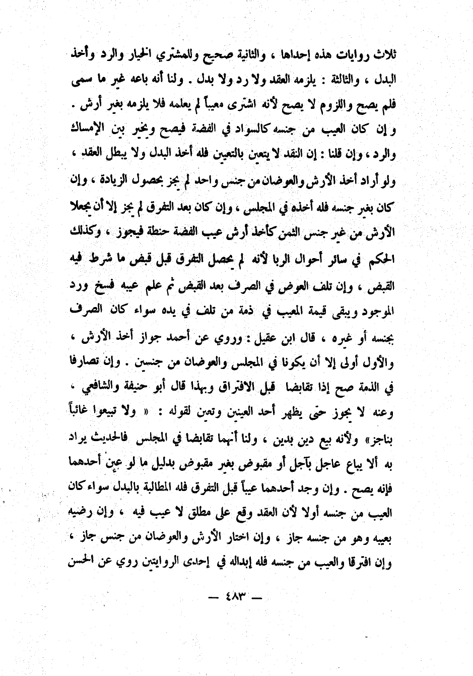 وإن كان العيب من جنسه، كالسواد في الفضة، فيصح، ويخيّر بين الإمساك والرد. وإن قلنا: إن النقد لا يتعين بالتعيين، فله أخذ البدل ولا يبطل العقد ولو أراد أخذ الأرش، والعوضان من جنس واحد لم يجز بحصول الزيادة، وإن كان بغير جنسه فله أخذه في المجلس. وإن كان بعد التفرق لم يجز، إلا أن يجعلا الأرش من غير جنس الثمن، كأخذ أرش عيب الفضة حنطة فيجوز. وكذلك الحكم في سائر أحوال الربا، لأنه لم يحصل التفرق قبل قبض ما شرط فيه القبض. وإن تلف العوض في الصرف بعد القبض، ثم علم عيبه، فسخ ورد الموجود، ويبقى قيمة المعيب في ذمة من تلف في يده، سواء كان الصرف بجنسه أو غيره. قال ابن عقيل: وروي عن أحمد جواز أخذ الأرش، والأول أولى، إلا أن يكونا في المجلس والعوضان من جنسين.