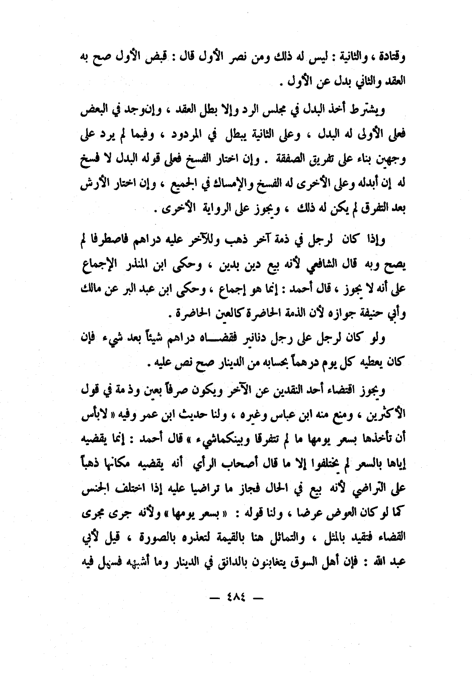 ويجوز اقتضاء أحد النقدين عن الآخر، ويكون صرفاً بعين وذمة، في قول الأكثرين. ومنع منه ابن عباس وغيره. ولنا: حديث ابن عمر، وفيه: "لا بأس أن تأخذها بسعر يومها، ما لم تتفرقا وبينكما شيء". 1 قال أحمد: إنما يقضيه إياها بالسعر، لم يختلفوا، إلا ما قال أصحاب الرأي: أنه يقضيه مكانها ذهباً على التراضي، لأنه بيع في الحال، فجاز ما تراضيا عليه إذا اختلف الجنس، كما لو كان العوض عرضاً. ولنا: قوله: "بسعر يومها "، ولأنه جرى مجرى القضاء فتقيد بالمثل، والتماثل هنا بالقيمة لتعذره بالصورة. قيل لأبي عبد الله: فإن أهل السوق يتغابنون بالدانق في الدينار وما أشبهه، فسهل فيه