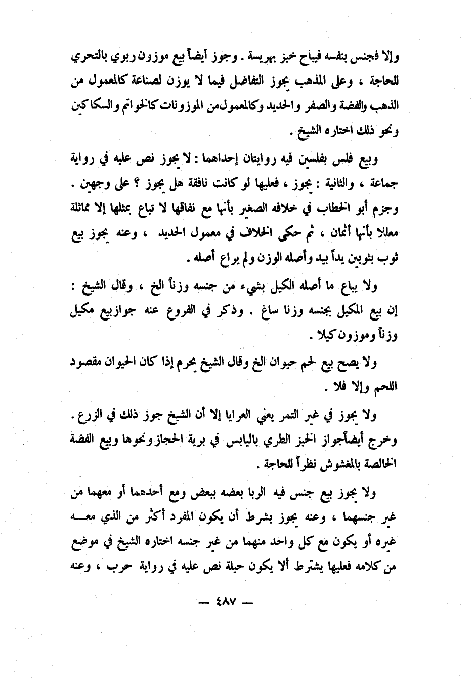 وجوز أيضاً بيع موزون ربوي بالتحري للحاجة. وعلى المذهب، يجوز التفاضل فيما لا يوزن لصناعة، كالمعمول من الذهب والفضة، والصفر والحديد، وكالمعمول من الموزونات كالخواتم والسكاكين ونحو ذلك، اختاره الشيخ.
