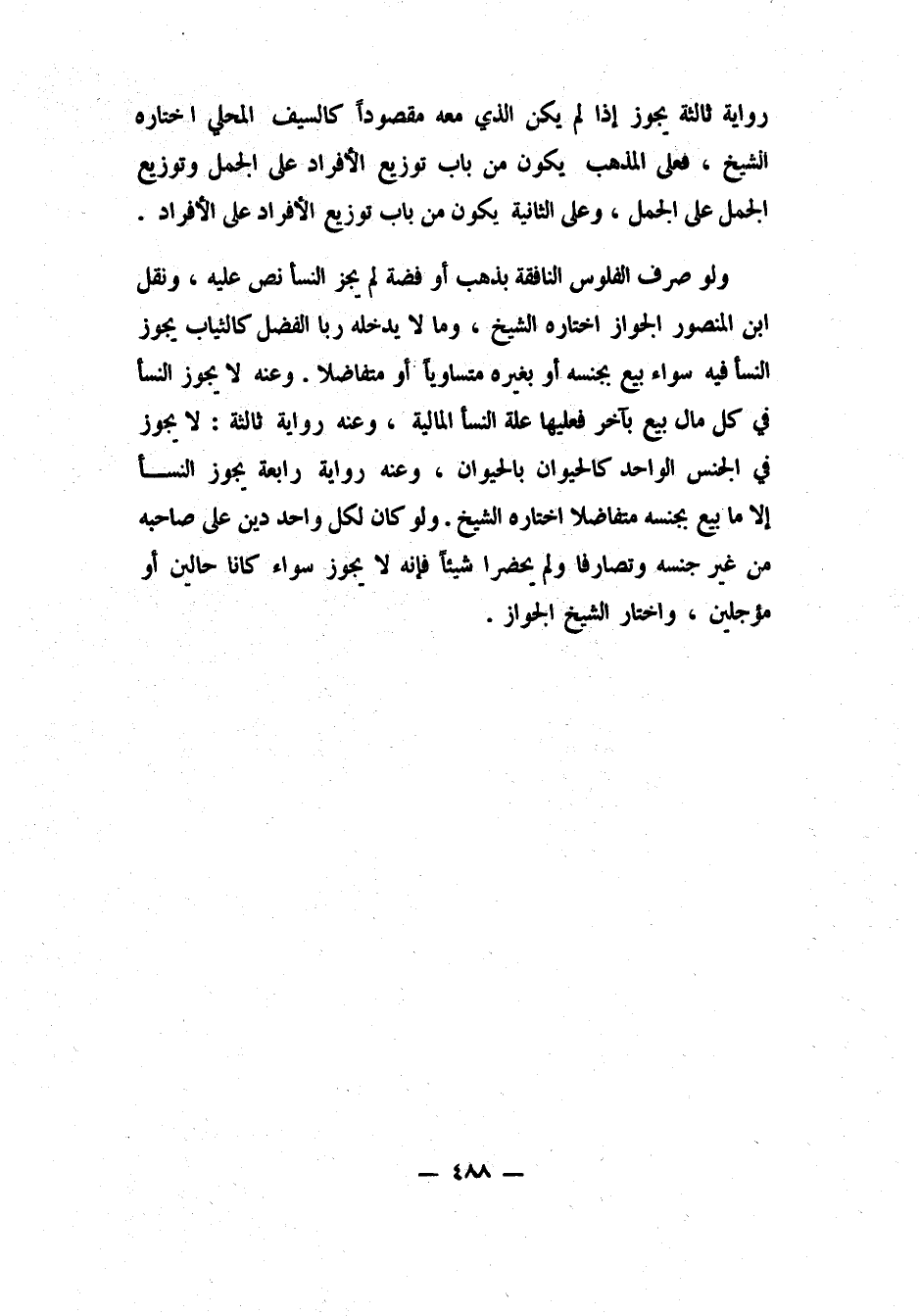 ولو صرف الفلوس النافقة بذهب أو فضة لم يجز النسأ، نص عليه. ونقل ابن المنصور: الجواز، اختاره الشيخ. وما لا يدخله ربا الفضل كالثياب يجوز النسأ، فيه سواء بيع بجنسه أو بغيره، متساوياً أو متفاضلاً. وعنه: لا يجوز النسأ في كل مال بيع بآخر؛ فعليها، علة النسإ: المالية. وعنه رواية ثالثة: لا يجوز في الجنس الواحد، كالحيوان بالحيوان. وعنه رواية رابعة: يجوز النسأ إلا ما بيع بجنسه متفاضلاً، اختاره الشيخ.
