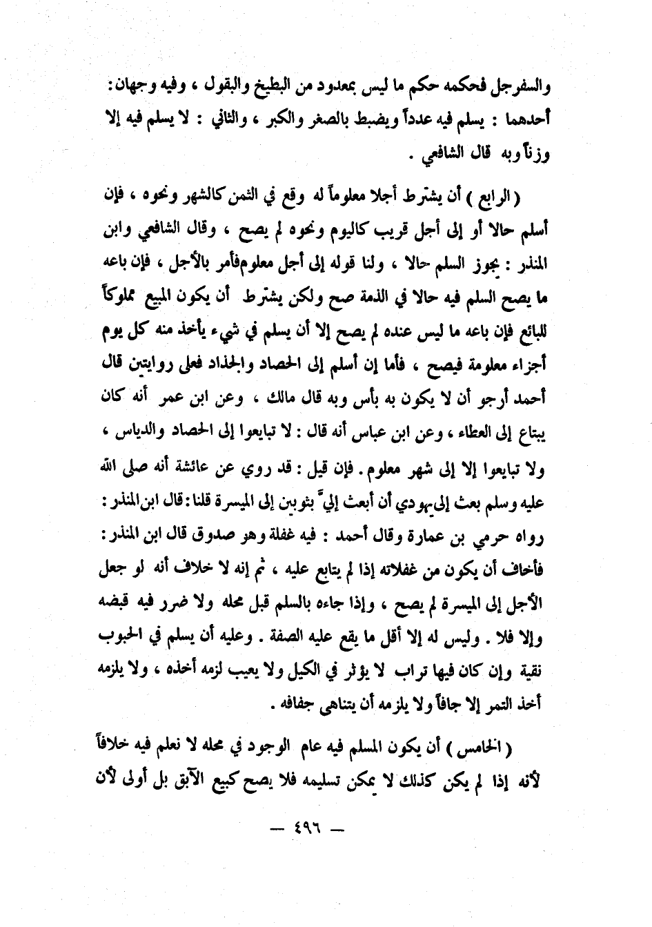 (الخامس) : أن يكون المسلَم فيه عام الوجود في محله، لا نعلم فيه خلافاً، لأنه إذا لم يكن كذلك لا يمكن تسليمه، فلا يصح، كبيع الآبق، بل أولى، لأن