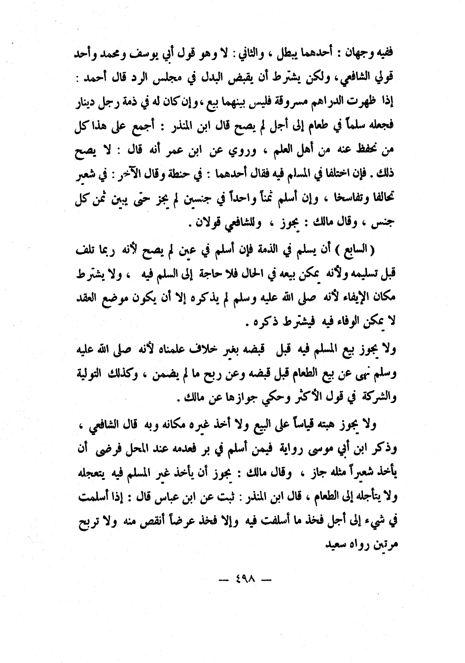 (السابع) : أن يسلم في الذمة، فإن أسلم في عين لم يصح، لأنه ربما تلف قبل تسليمه، ولأنه يمكن بيعه في الحال، فلا حاجة إلى السلَم فيه. ولا يشترط مكان الإيفاء، لأنه صلى الله عليه وسلم لم يذكره، إلا أن يكون موضع العقد لا يمكن الوفاء فيه، فيشترط ذكره.