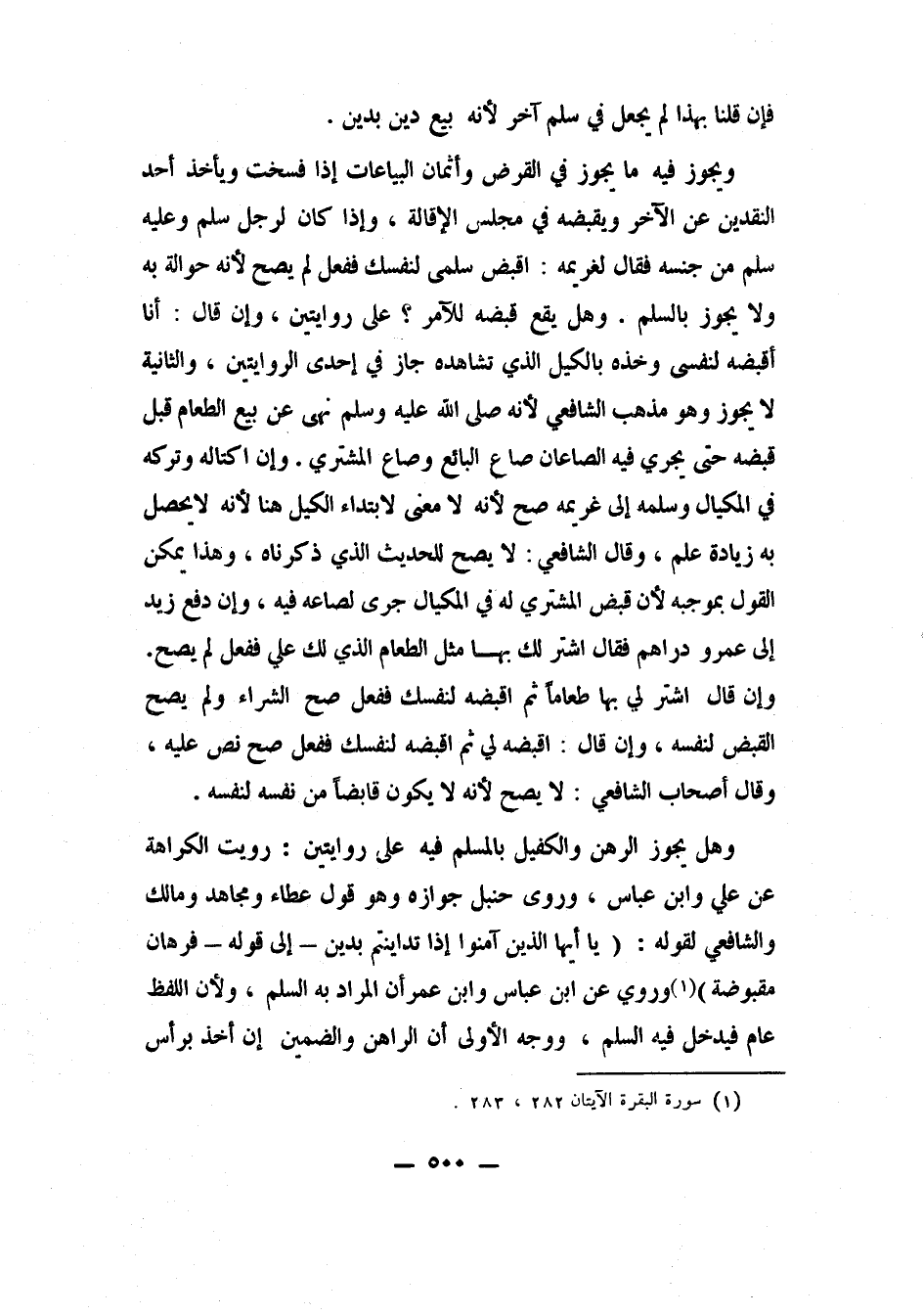 وهل يجوز الرهن والكفيل بالمسلَم فيه، على روايتين: رويت الكراهة عن علي وابن عباس. وروى حنبل جوازه، وهو قول عطاء ومجاهد ومالك والشافعي، لقوله: {يَا أَيُّهَا الَّذِينَ آمَنُوا إِذَا تَدَايَنْتُمْ بِدَيْنٍ} 2 - إلى قوله - {فَرِهَانٌ مَقْبُوضَةٌ} . 3 وروي عن ابن عباس وابن عمر: " أن المراد به السلَم"، ولأن اللفظ عام فيدخل فيه السلَم. ووجه الأولى: أن الراهن والضمين إن أخذ برأس
