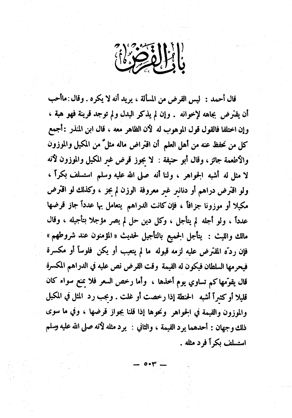 قال ابن المنذر: أجمع كل من نحفظ عنه من أهل العلم: أن اقتراض ما له مثلٌ من المكيل والموزون والأطعمة جائز. وقال أبو حنيفة: لا يجوز قرض غير المكيل والموزون، لأنه لا مثل له، أشبه الجواهر.. ولنا: "أنه صلى الله عليه وسلم استسلف بكراً". 1 ولو اقترض دراهم أو دنانير غير معروفة الوزن، لم يجز، وكذلك لو اقترض مكيلاً أو موزوناً جزافاً. فإن كانت الدراهم يتعامل بها عدداً جاز قرضها عدداً. ولو أجّله لم يتأجل، وكل دين حلّ لم يصر مؤجّلا بتأجيله. وقال مالك والليث: يتأجل الجميع بالتأجيل، لحديث: "المؤمنون عند شروطهم". فإن ردّه المقترض عليه، لزمه قبوله ما لم يتعيب أو يكن فلوساً أو مكسرة فيحرمها السلطان، فيكون له القيمة وقت القرض، نص عليه في الدراهم المكسرة، قال يقوّمها كم تساوي يوم أخذها. وأما رخص السعر فلا يمنع، سواء كان قليلاً أو كثيراً، أشبه الحنطة إذا رخصت أو غلت.