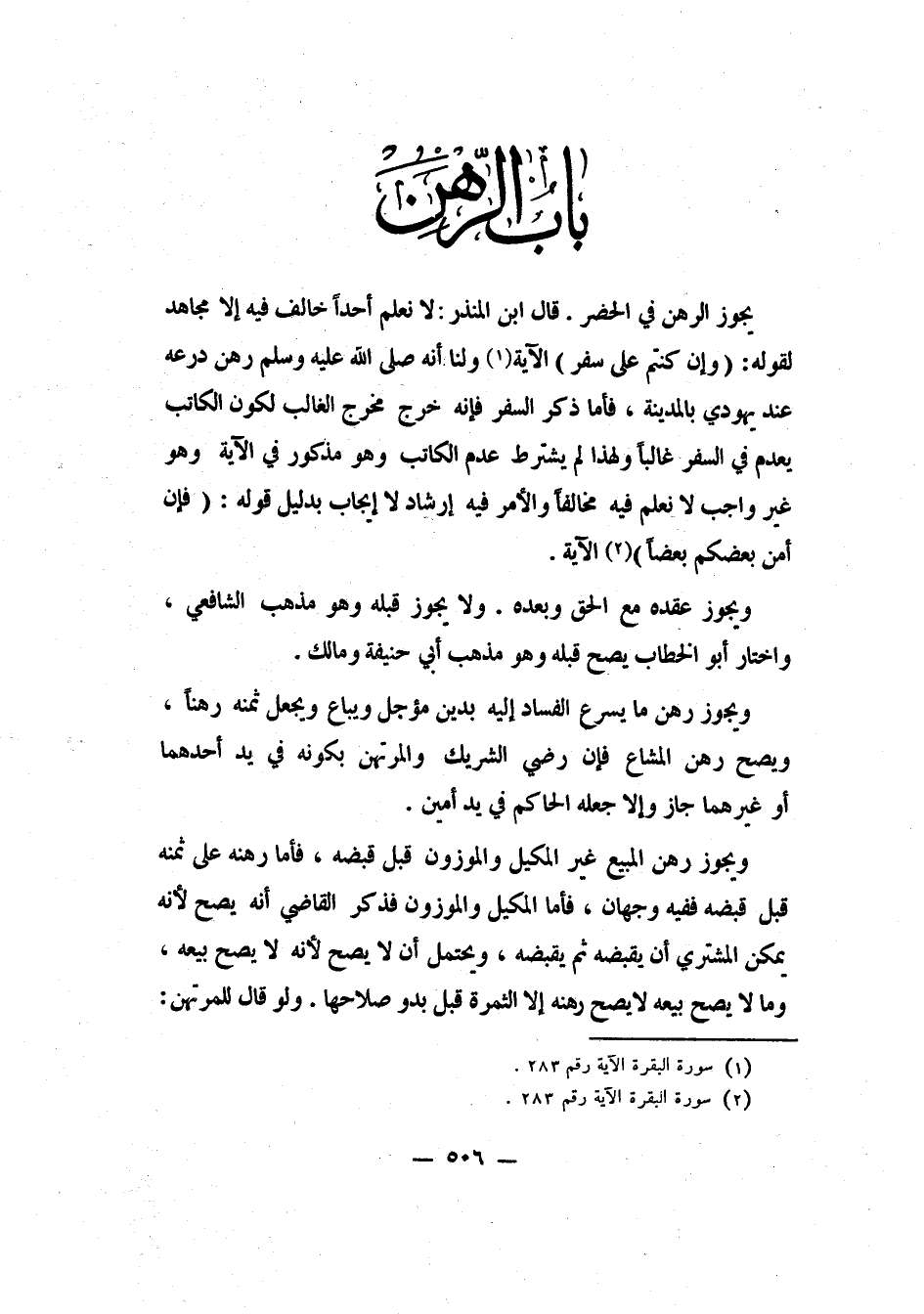 يجوز الرهن في الحضر. قال ابن المنذر: لا نعلم أحداً خالف فيه إلا مجاهد لقوله: {وَإِنْ كُنْتُمْ عَلَى سَفَرٍ} الآية. 1 ولنا: "أنه صلى الله عليه وسلم رهن درعه عند يهودي بالمدينة". 2 فأما ذكر السفر فإنه خرج مخرج الغالب، لكون الكاتب يعدم في السفر غالباً، ولهذا لم يشترط عدم الكاتب، وهو مذكور في الآية، وهو غير واجب، لا نعلم فيه مخالفاًً. والأمر فيه إرشاد لا إيجاب، بدليل قوله: {فَإِنْ أَمِنَ بَعْضُكُمْ بَعْضاً} الآية.