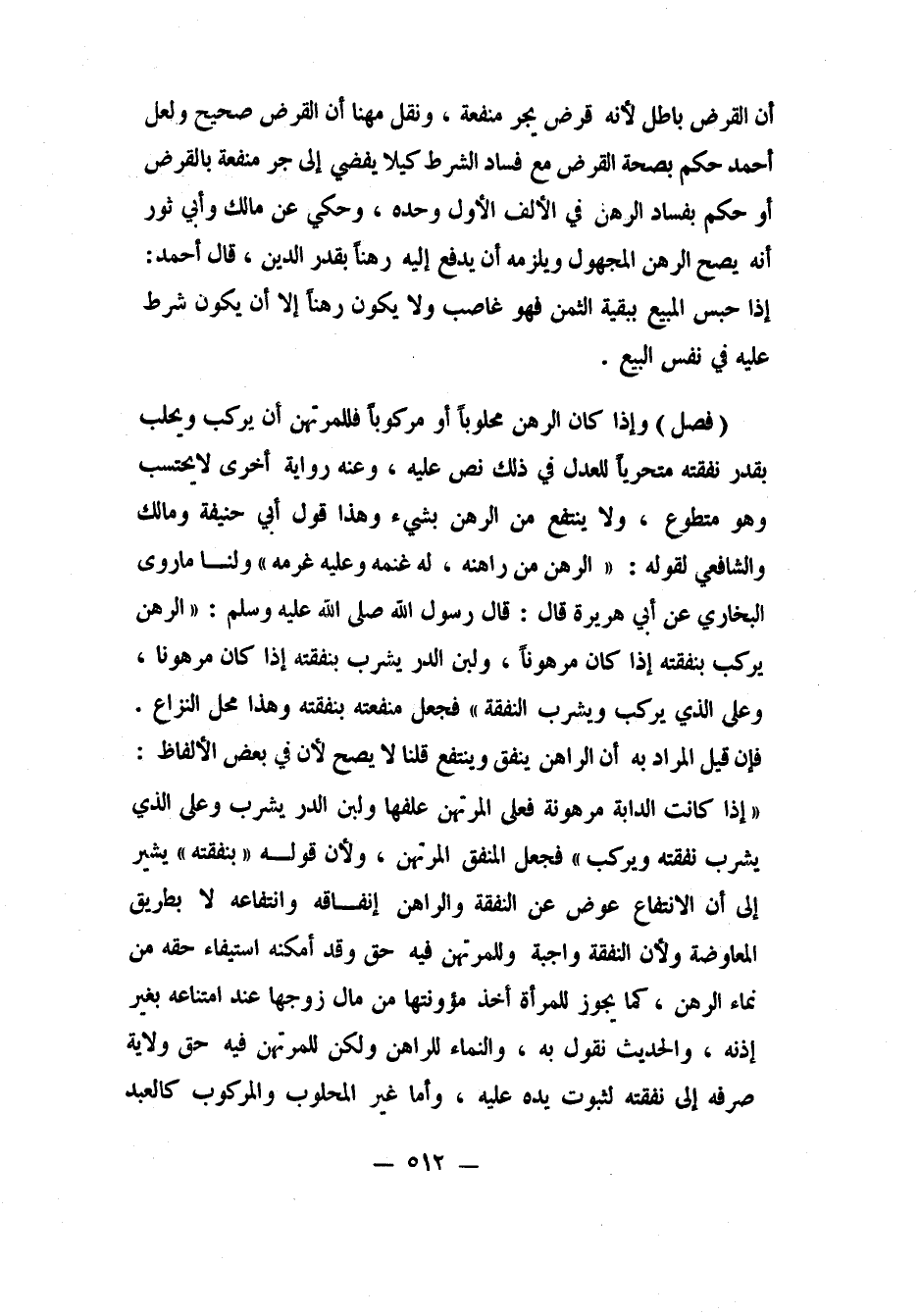 فإن قيل: المراد به أن الراهن ينفق وينتفع، قلنا: لا يصح لأن في بعض الألفاظ: " إذا كانت الدابة مرهونة فعلى المرتهن علفها، ولبن الدر يشرب، وعلى الذي يشرب نفقته ويركب"، 2 فجعل المنفق المرتهن، ولأن قوله: "بنفقته" يشير إلى أن الانتفاع عوض عن النفقة، والراهن إنفاقه وانتفاعه لا بطريق المعاوضة، ولأن النفقة واجبة وللمرتهن فيه حق، وقد أمكنه استيفاء حقه من نماء الرهن، كما يجوز للمرأة أخذ مؤونتها من مال زوجها عند امتناعه بغير إذنه. والحديث نقول به، والنماء للراهن، ولكن للمرتهن فيه حق ولاية صرفه إلى نفقته لثبوت يده عليه. وأما غير المحلوب والمركوب كالعبد
