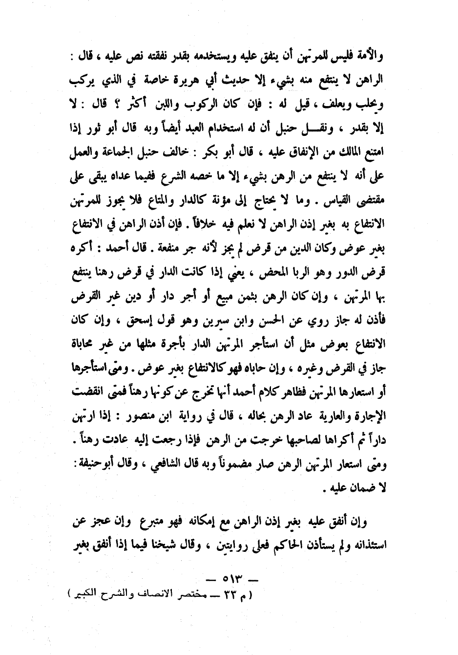 والأمة، فليس للمرتهن أن ينفق عليه ويستخدمه بقدر نفقته، نص عليه. قال: الراهن لا ينتفع منه بشيء، إلا حديث أبي هريرة خاصة في الذي يركب ويحلب ويعلف. قيل له: فإن كان الركوب واللبن أكثر؟ قال: لا، إلا بقدر. ونقل حنبل أن له استخدام العبد أيضاً، وبه قال أبو ثور. إذا امتنع المالك من الإنفاق عليه، قال أبو بكر: خالف حنبل الجماعة، والعمل على أنه لا ينتفع من الرهن بشيء إلا ما خصه الشرع، ففيما عداه يبقى على مقتضى القياس.