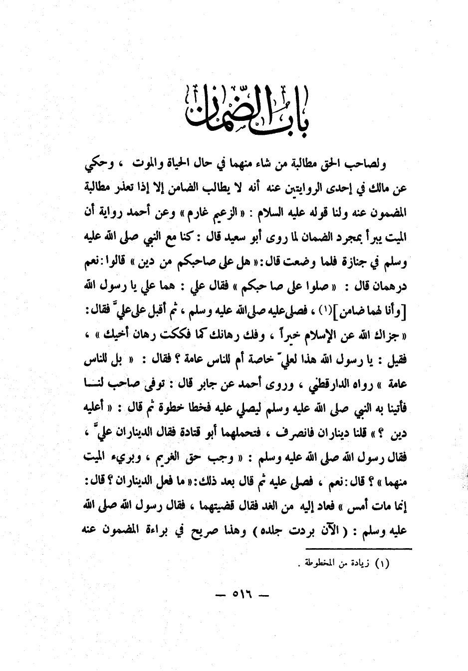 ولصاحب الحق مطالبة من شاء منهما في حال الحياة والموت، وحكي عن مالك في إحدى الروايتين عنه: أنه لا يطالب الضامن إلا إذا تعذر مطالبة المضمون عنه. ولنا: قوله عليه السلام: "الزعيم غارم". 1 وعن أحمد رواية أن الميت يبرأ بمجرد الضمان، لما روى أبو سعيد قال: "كنا مع النبي صلى الله عليه وسلم في جنازة، فلما وضعت قال: هل على صاحبكم من دين، قالوا: نعم درهمان. قال: صلّوا على صاحبكم. فقال عليٌّ: هما عليَّ يا رسول الله. [وأنا لهما ضامن] . 2 فصلى عليه صلى الله عليه وسلم ثم أقبل على عليٍّ فقال: جزاك الله عن الإسلام خيراً، وفك رهانك كما فككت رهان أخيك. فقيل: يا رسول الله، هذا لعليّ خاصة أم للناس عامة؟ فقال: بل للناس عامة". رواه الدارقطني.