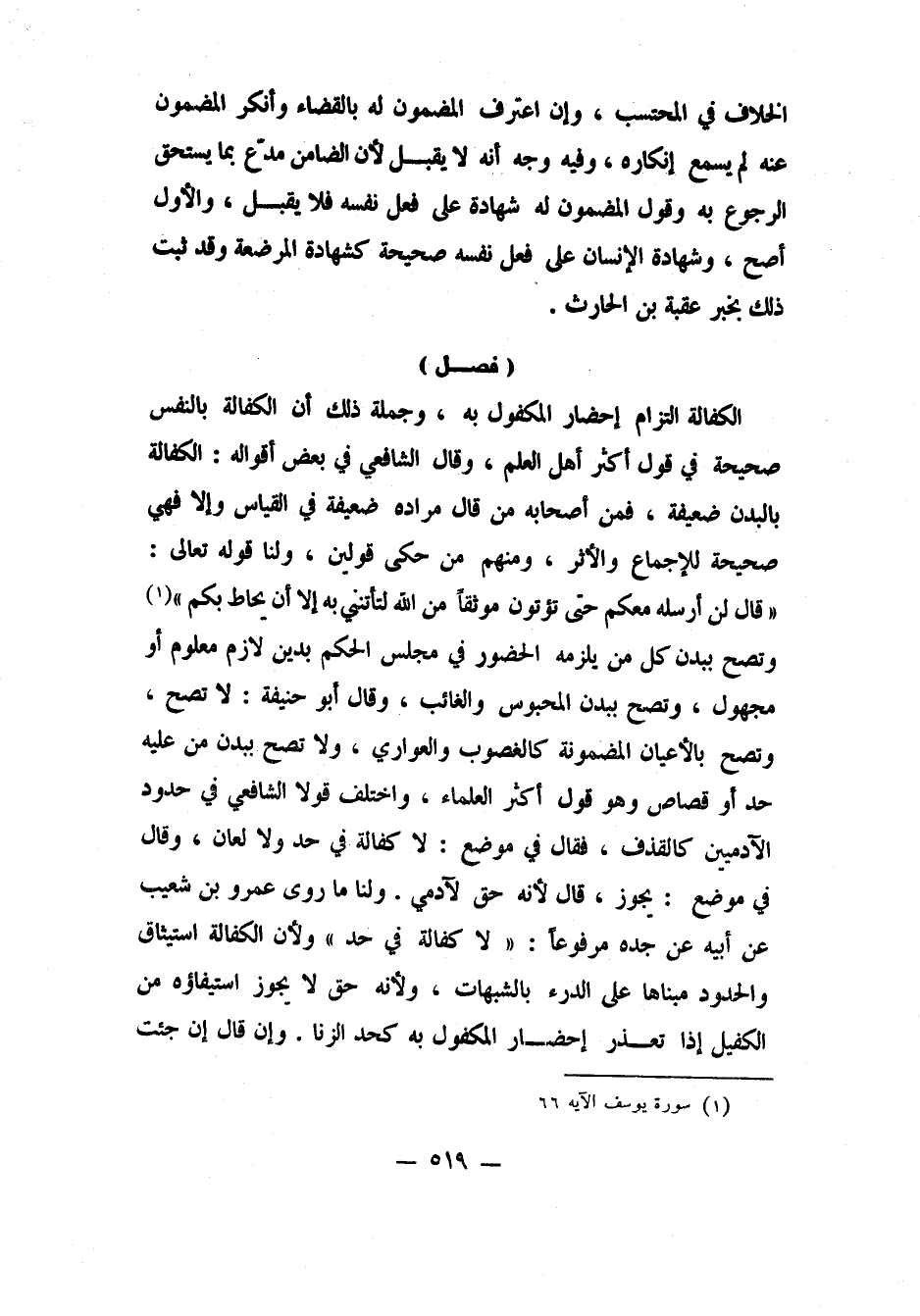 (فصل) : الكفالة التزام إحضار المكفول به، وجملة ذلك أن الكفالة بالنفس صحيحة، في قول أكثر أهل العلم. وقال الشافعي في بعض أقواله: الكفالة بالبدن ضعيفة. فمن أصحابه من قال: مراده: ضعيفة في القياس، وإلا فهي صحيحة، للإجماع والأثر. ومنهم من حكى قولين. ولنا: قوله تعالى: {قَالَ لَنْ أُرْسِلَهُ مَعَكُمْ حَتَّى تُؤْتُونِ مَوْثِقاً مِنَ اللَّهِ لَتَأْتُنَّنِي بِهِ إِلاَّ أَنْ يُحَاطَ بِكُمْ} . 1 وتصح ببدن كل من يلزمه الحضور في مجلس الحكم بديْن لازم، معلوم أو مجهول. وتصح ببدن المحبوس والغائب. وقال أبو حنيفة: لا تصح. وتصح بالأعيان المضمونة، كالغصوب والعواري. ولا تصح ببدن من عليه حد أو قصاص، وهو قول أكثر العلماء. واختلف قولا الشافعي في حدود الآدميين كالقذف، فقال في موضع: لا كفالة في حد ولا لعان. وقال في موضع: يجوز، قال: لأنه حق لآدمي. ولنا: ما روى عمرو بن شعيب عن أبيه عن جده، مرفوعاً: "لا كفالة في حد"، ولأن الكفالة استيثاق، والحدود مبناها على الدرء بالشبهات، ولأنه حق لا يجوز استيفاؤه من الكفيل إذا تعذر إحضار المكفول به كحد الزنى.