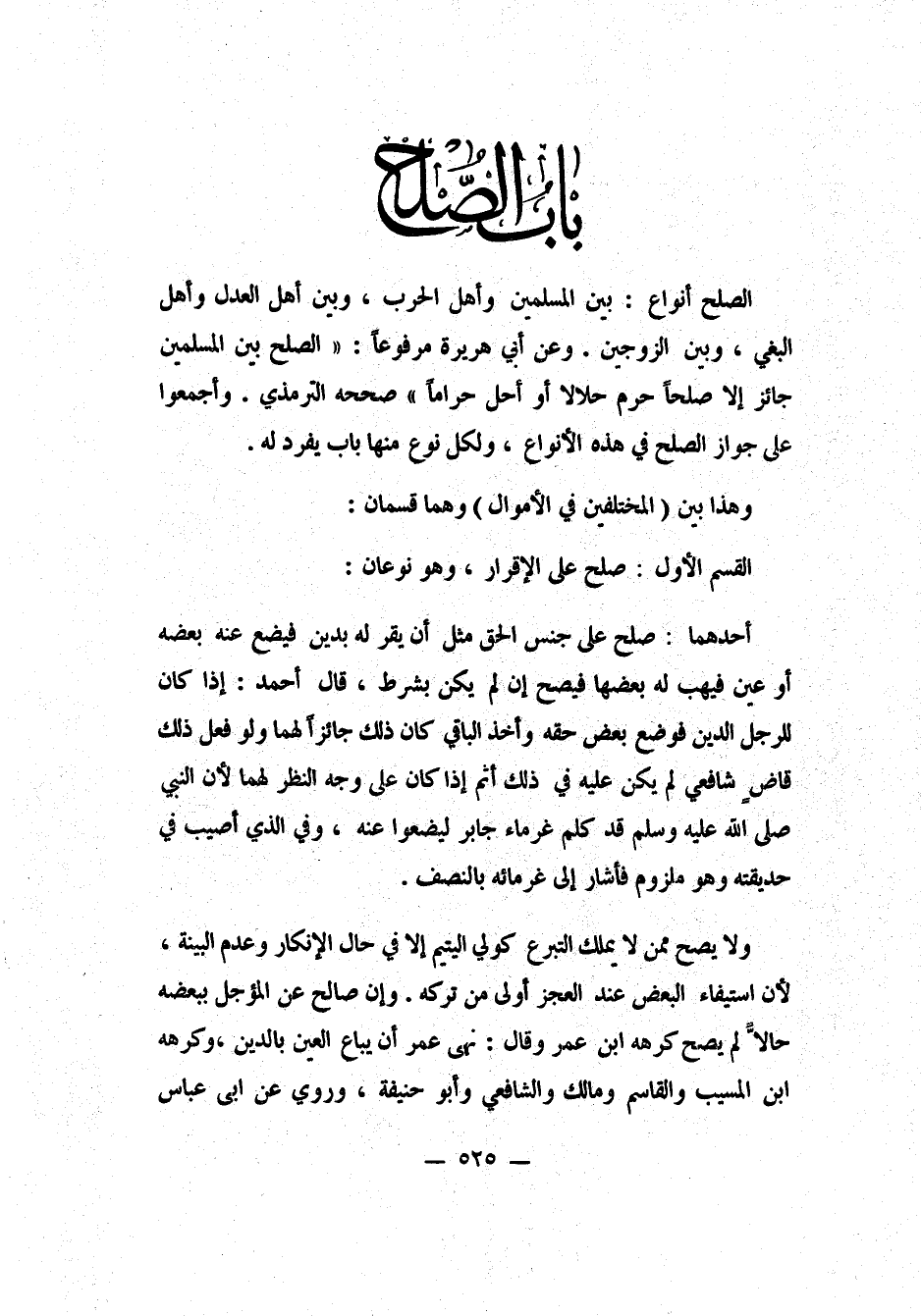 الصلح أنواع: بين المسلمين وأهل الحرب، وبين أهل العدل وأهل البغي، وبين الزوجين. وعن أبي هريرة، مرفوعاً: "الصلح بين المسلمين جائز، إلا صلحاً حرّم حلالاً أو أحلّ حراماً". 1 صححه الترمذي. وأجمعوا على جواز الصلح في هذه الأنواع، ولكل نوع منها باب يفرد له.