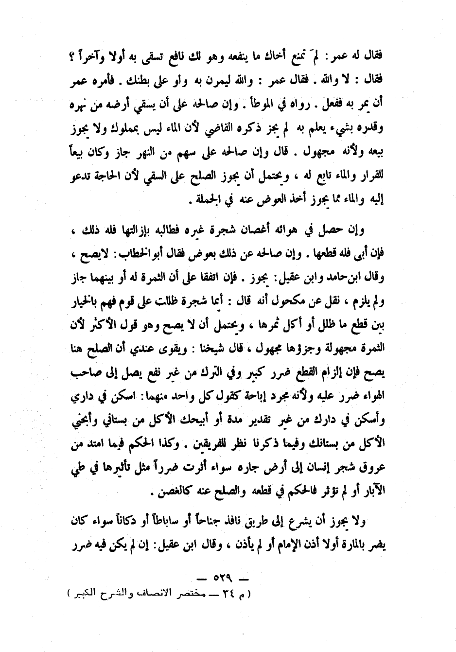فقال له عمر: لِمَ تمنع أخاك ما ينفعه وهو لك نافع؟ تسقي به أولاً وآخراً؟ فقال: لا والله. فقال عمر: والله ليمرّنّ به ولو على بطنك. فأمره عمر أن يمر به، ففعل". رواه في الموطإ. وإن صالحه على أن يسقي أرضه من نهره، وقدره بشيء يعلم به، لم يجز؛ ذكره القاضي، لأن الماء ليس بمملوك، ولا يجوز بيعه، ولأنه مجهول. قال: وإن صالحه على سهم من النهر جاز، وكان بيعاً للقرار، والماء تابع له. ويحتمل أن يجوز الصلح على السقي، لأن الحاجة تدعو إليه، والماء مما يجوز أخذ العوض عنه في الجملة.