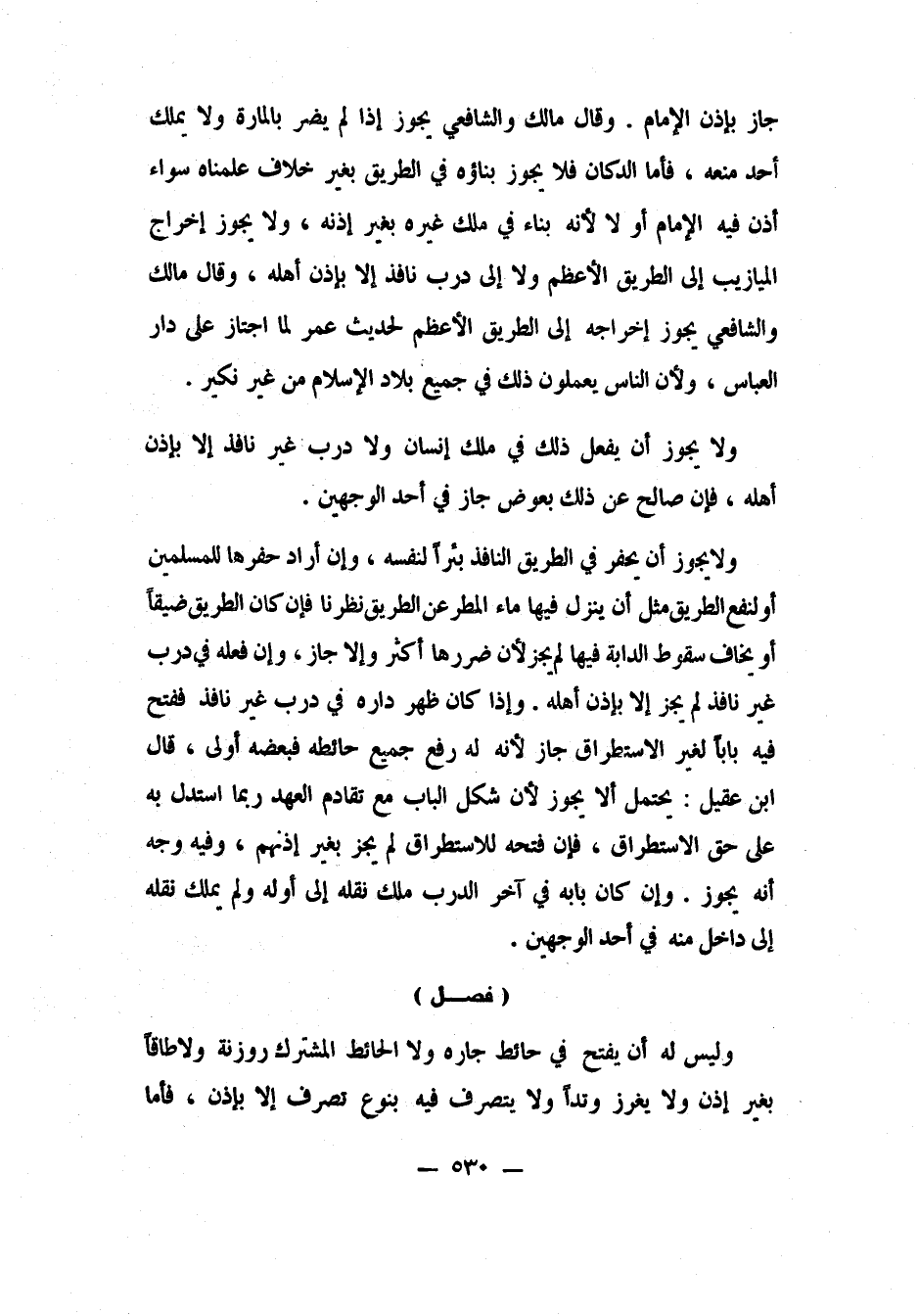 ولا يجوز أن يحفر في الطريق النافذ بئراً لنفسه، وإن أراد حفرها للمسلمين أو لنفع الطريق، مثل أن ينزل فيها ماء المطر عن الطريق، نظرنا: فإن كان الطريق ضيقاً أو يخاف سقوط الدابة فيها لم يجز، لأن ضررها أكثر، وإلا جاز. وإن فعله في درب غير نافذ، لم يجز إلا بإذن أهله. وإذا كان ظهر داره في درب غير نافذ، ففتح فيه بابا لغير الاستطراق، جاز لأنه له رفع جميع حائطه فبعضه أولى. قال ابن عقيل: يحتمل ألا يجوز، لأن شكل الباب مع تقادم العهد ربما استدل به على حق الاستطراق، فإن فتحه للاستطراق لم يجز بغير إذنهم، وفيه وجه: أنه يجوز. وإن كان بابه في آخر الدرب، ملَك نقله إلى أوله، ولم يملك نقله إلى داخل منه، في أحد الوجهين.