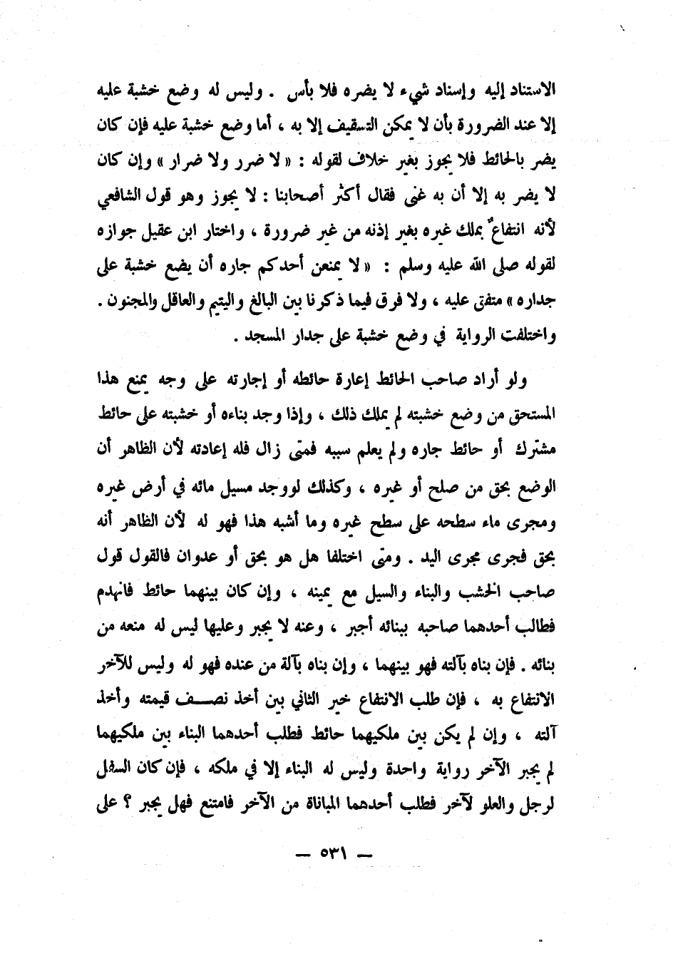 الاستناد إليه وإسناد شيء لا يضره فلا بأس. وليس له وضع خشبة عليه إلا عند الضرورة، بأن لا يمكن التسقيف إلا به. أما وضع خشبة عليه، فإن كان يضر بالحائط فلا يجوز، بغير خلاف، لقوله: "لا ضرر ولا ضرار". 1 وإن كان لا يضرّ به إلا أن به غنى، فقال أكثر أصحابنا: لا يجوز. وهو قول الشافعي، لأنه انتفاعٌ بملك غيره بغير إذنه من غير ضرورة. واختار ابن عقيل جوازه، لقوله صلى الله عليه وسلم: "لا يمنعنّ أحدكم جاره أن يضع خشبة على جداره". 2 متفق عليه. ولا فرق فيما ذكرنا بين البالغ واليتيم والعاقل والمجنون. واختلفت الرواية في وضع خشبة على جدار المسجد.