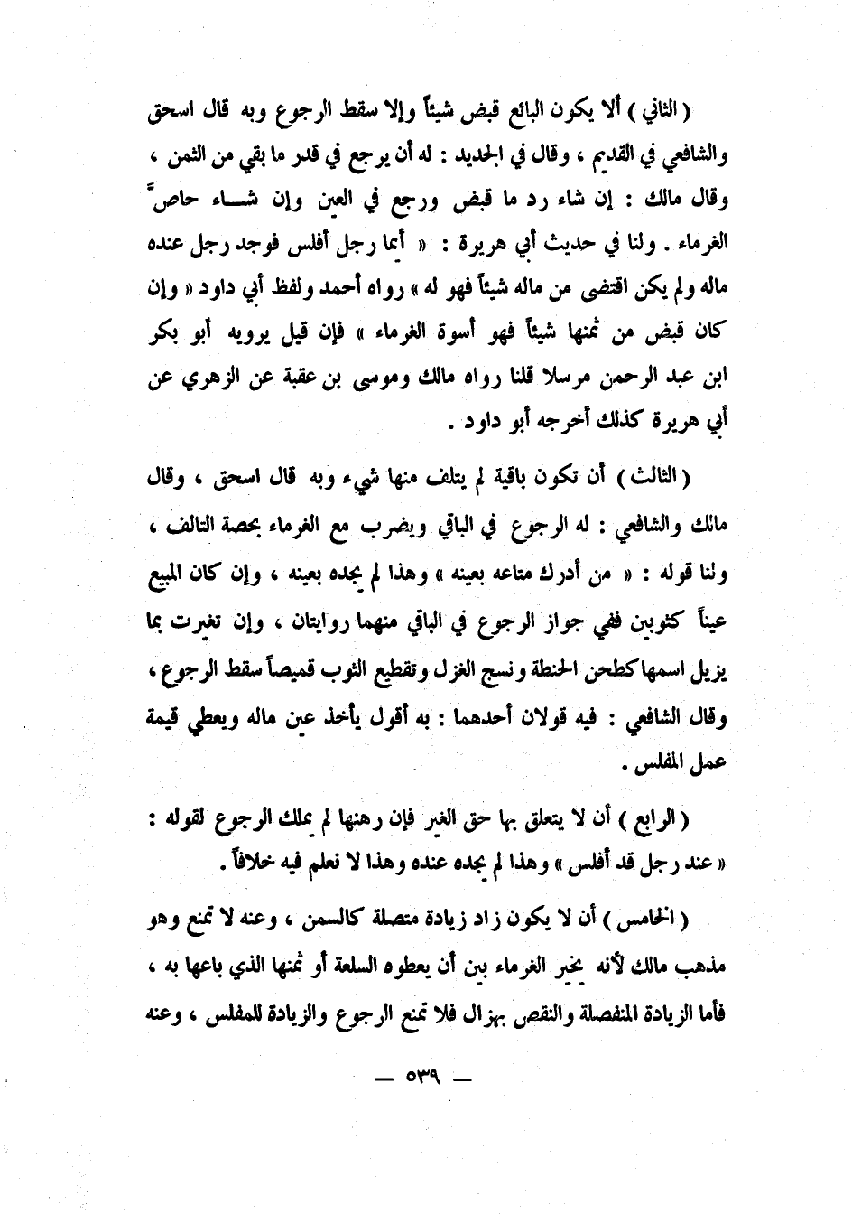 (الثاني) : ألا يكون البائع قبض شيئاً وإلا سقط الرجوع، وبه قال إسحاق والشافعي في القديم. وقال في الجديد: له أن يرجع في قدر ما بقي من الثمن. وقال مالك: إن شاء رد ما قبض ورجع في العين، وإن شاء حاصَّ الغرماء. ولنا: في حديث أبي هريرة: "أيما رجل أفلس، فوجد رجل عنده ماله ولم يكن اقتضى من ماله شيئاً، فهو له". 1 رواه أحمد، ولفظ أبي داود "وإن كان قبض من ثمنها شيئاً، فهو أسوة الغرماء". 2 فإن قيل: يرويه أبو بكر بن عبد الرحمن مرسلاً، قلنا رواه مالك وموسى بن عقبة عن الزهري عن أبي هريرة، كذلك أخرجه أبو داود.