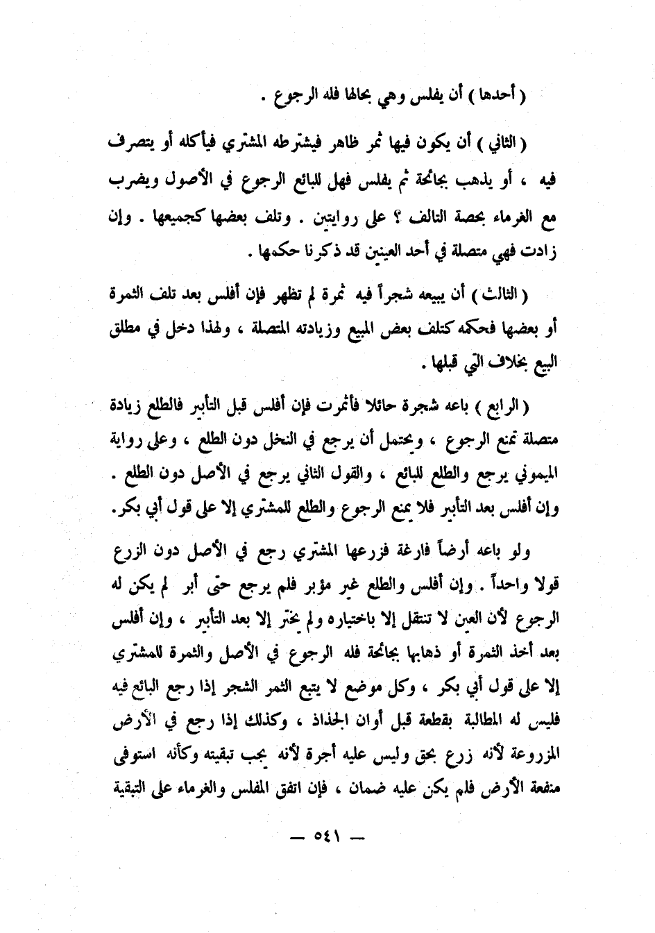 (الرابع) : باعه شجرة حائلاً فأثمرت، فإن أفلس قبل التأبير، فالطلع زيادة متصلة تمنع الرجوع؛ ويحتمل أن يرجع في النخل دون الطلع. وعلى رواية الميموني: يرجع والطلع للبائع. والقول الثاني: يرجع في الأصل دون الطلع. وإن أفلس بعد التأبير، فلا يمنع الرجوع، والطلع للمشتري، إلا على قول أبي بكر. ولو باعه أرضاً فارغة فزرعها المشتري، رجع في الأصل دون الزرع، قولاً واحداً. وإن أفلس والطلع غير مؤبر، فلم يرجع حتى أبر، لم يكن له الرجوع، لأن العين لا تنتقل إلا باختياره، ولم يختر إلا بعد التأبير. وإن أفلس بعد أخذ الثمرة أو ذهابها بجائحة، فله الرجوع في الأصل، والثمرة للمشتري، إلا على قول أبي بكر. وكل موضع لا يتبع الثمر الشجر إذا رجع البائع فيه، فليس له المطالبة بقطعه قبل أوان الجذاذ؛ وكذلك إذا رجع في الأرض المزروعة، لأنه زرع بحق، وليس عليه أجرة، لأنه يجب تبقيته، وكأنه استوفى منفعة الأرض فلم يكن عليه ضمان. فإن اتفق المفلس والغرماء على التبقية