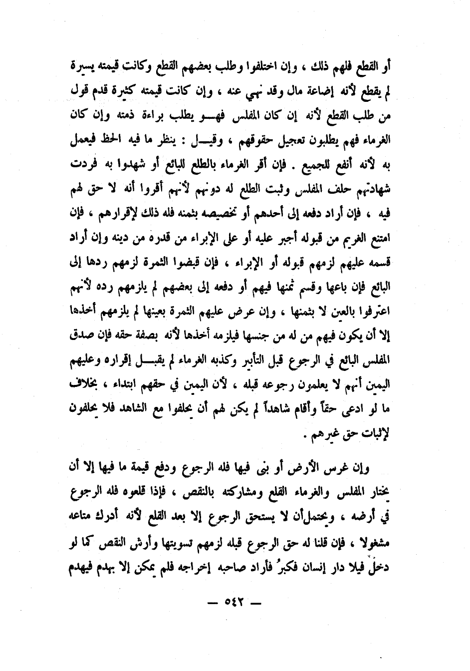 أو القطع فلهم ذلك؛ وإن اختلفوا وطلب بعضهم القطع وكانت قيمته يسيرة، لم يقطع لأنه إضاعة مال، وقد نهي عنه. وإن كانت قيمته كثيرة، قدم قول من طلب القطع، لأنه إن كان المفلس فهو يطلب براءة ذمته، وإن كان الغرماء فهم يطلبون تعجيل حقوقهم. وقيل: ينظر ما فيه الحظ فيعمل به، لأنه أنفع للجميع. فإن أقر الغرماء بالطلع للبائع، أو شهدوا به فردت شهادتهم، حلف المفلس وثبت الطلع له دونهم، لأنهم أقروا أنه لا حق لهم فيه. فإن أراد دفعه إلى أحدهم أو تخصيصه بثمنه، فله ذلك لإقرارهم. فإن امتنع الغريم من قبوله، أُجبر عليه أو على الإبراء من قدره من ديْنه. وإن أراد قسمه عليهم، لزمهم قبوله أو الإبراء. فإن قبضوا الثمرة لزمهم ردها إلى البائع؛ فإن باعها وقسم ثمنها فيهم أو دفعه إلى بعضهم، لم يلزمهم رده، لأنهم اعترفوا بالعين لا بثمنها. وإن عرض عليهم الثمرة بعينها، لم يلزمهم أخذها، إلا أن يكون فيهم من له من جنسها، فيلزمه أخذها، لأنه بصفة حقه. فإن صدق المفلس البائع في الرجوع قبل التأبير، وكذبه الغرماء، لم يقبل إقراره وعليهم اليمين أنهم لا يعلمون رجوعه قبله، لأن اليمين في حقهم ابتداء، بخلاف ما لو ادعى حقاً وأقام شاهداً لم يكن لهم أن يحلفوا مع الشاهد، فلا يحلفون لإثبات حق غيرهم.