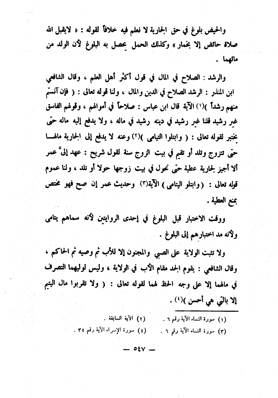 والرشد: الصلاح في المال، في قول أكثر أهل العلم. وقال الشافعي وابن المنذر: الرشد الصلاح في الدين والمال. ولنا: قوله تعالى: {فَإِنْ آنَسْتُمْ مِنْهُمْ رُشْداً} الآية، 2 قال ابن عباس: "صلاحاً في أموالهم". وقولهم: الفاسق غير رشيد، قلنا: غير رشيد في دينه، رشيد في ماله. ولا يدفع إليه ماله حتى يُختبر، لقوله تعالى: {وَابْتَلُوا الْيَتَامَى} . 3 وعنه: لا يُدفع إلى الجارية مالها حتى تتزوج وتلد، أو تقيم في بيت الزوج سنة، لقول شريح: "عهد إليَّ عمر ألا أجيز لجارية عطية حتى تحول في بيت زوجها حولاً أو تلد". ولنا: عموم قوله تعالى: {وَابْتَلُوا الْيَتَامَى} الآية، 4وحديث عمر إن صح، فهو مختص بمنع العطية. ووقت الاختبار قبل البلوغ في إحدى الروايتين، لأنه سماهم يتامى، ولأنه مد اختبارهم إلى البلوغ. ولا تثبت الولاية على الصبي والمجنون إلا للأب، ثم وصيه، ثم الحاكم. وقال الشافعي: يقوم الجد مقام الأب في الولاية. وليس لوليهما التصرف في مالهما إلا على وجه الحظ لهما، لقوله تعالى: {وَلا تَقْرَبُوا مَالَ الْيَتِيمِ إِلاَّ بِالَّتِي هِيَ أَحْسَنُ} 5.