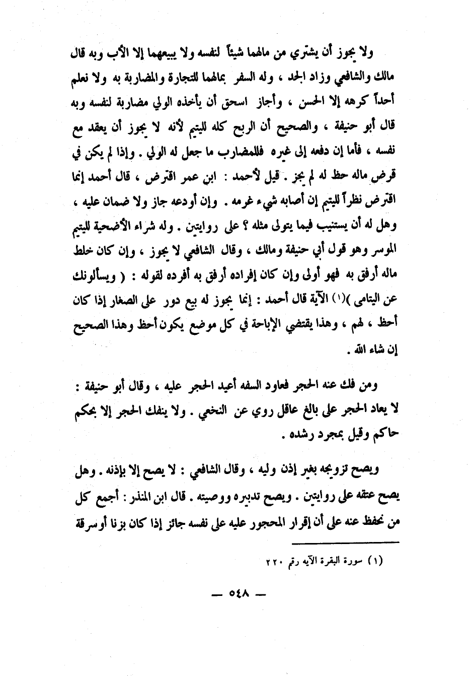 ولا يجوز أن يشتري من مالهما شيئاً لنفسه ولا يبيعهما إلا الأب، وبه قال مالك والشافعي، وزاد الجد. وله السفر بمالهما للتجارة والمضاربة به، ولا نعلم أحداً كرهه إلا الحسن. وأجاز إسحاق أن يأخذه الولي مضاربة لنفسه، وبه قال أبو حنيفة؛ والصحيح: أن الربح كله لليتيم، لأنه لا يجوز أن يعقد مع نفسه. فأما إن دفعه إلى غيره، فللمضارب ما جعل له الولي. وإذا لم يكن في قرض ماله حظ له لم يجز. قيل لأحمد: "ابن عمر اقترض"، قال أحمد: إنما اقترض نظراً لليتيم، إن أصابه شيء غرمه. وإن أودعه جاز ولا ضمان عليه، وهل له أن يستنيب فيما يتولى مثله؟ على روايتين. وله شراء الأضحية لليتيم الموسر، وهو قول أبي حنيفة ومالك، وقال الشافعي: لا يجوز. وإن كان خلط ماله أرفق به فهو أولى، وإن كان إفراده أرفق به أفرده، لقوله: {وَيَسْأَلونَكَ عَنِ الْيَتَامَى} الآية. 1 قال أحمد: إنما يجوز له بيع دور على الصغار إذا كان أحظ لهم، وهذا يقتضي الإباحة في كل موضع يكون أحظ؛ وهذا الصحيح إن شاء الله.