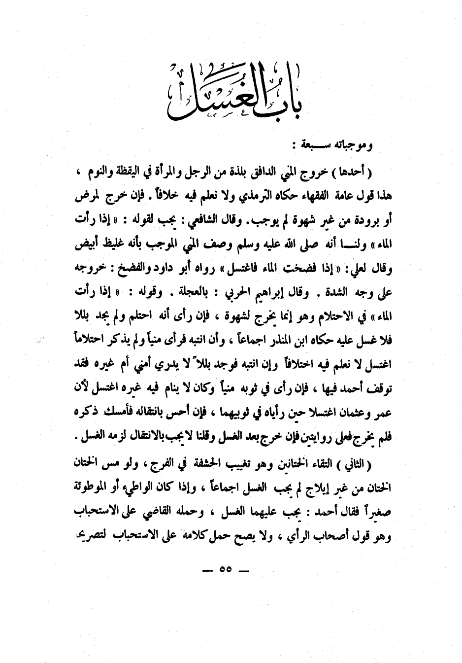 أحدها: خروج المني الدافق بلذة من الرجل والمرأة، في اليقظة والنوم: هذا قول عامة الفقهاء، حكاه الترمذي، ولا نعلم فيه خلافاً. فإن خرج لمرض أو برودة من غير شهوة، لم يوجب. وقال الشافعي: يجب، لقوله: "إذا رأت الماء". ولنا: أنه صلى الله عليه وسلم وصف المني الموجب بأنه غليظ أبيض، وقال لعلي: "إذا فضخت الماء فاغتسل". 1 رواه أبو داود. والفضخ: خروجه على وجه الشدة. وقال إبراهيم الحربي: بالعجلة. وقوله: "إذا رأت الماء" في الاحتلام. وهو إنما يخرج لشهوة، فإن رأى أنه احتلم ولم يجد بللاً، فلا غسل عليه؛ حكاه ابن المنذر إجماعاً. وإن انتبه فرأى منياً ولم يذكر احتلاماً، اغتسل؛ لا نعلم فيه اختلافاً. وإن انتبه فوجد بللاً لا يدري أمني أم غيره، فقد توقف أحمد فيها. فإن رأى في ثوبه منياً وكان لا ينام فيه غيره، اغتسل، "لأن عمر وعثمان اغتسلا حين رأياه في ثوبيهما". فإن أحس بانتقاله فأمسك ذكره فلم يخرج، فعلى روايتين. فإن خرج بعد الغسل، وقلنا: لا يجب بالانتقال، لزمه الغسل.