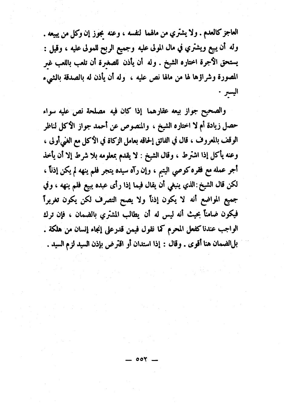 والصحيح: جواز بيعه عقارهما إذا كان فيه مصلحة، نص عليه، سواء حصل زيادة أم لا، اختاره الشيخ. والمنصوص عن أحمد: جواز الأكل لناظر الوقف بالمعروف، قال في الفائق: إلحاقه بعامل الزكاة في الأكل مع الغنى أولى؛ وعنه: يأكل إذا اشترط. وقال الشيخ: لا يقدم بمعلومه بلا شرط، إلا أن يأخذ أجر عمله مع فقره كوصي اليتيم. وإن رآه سيده يتجر فلم ينهه، لم يكن إذناً، لكن قال الشيخ: الذي ينبغي أن يقال فيما إذا رأى عبده يبيع فلم ينهه، وفي جميع المواضع، أنه لا يكون إذناً، ولا يصح التصرف، لكن يكون تغريراً فيكون ضامناً، بحيث أنه ليس له أن يطالب المشتري بالضمان. فإن ترك الواجب عندنا كفعل المحرم؛ كما نقول فيمن قدر على إنجاء إنسان من هلكة. بل الضمان هنا أقوى. وقال: إذا استدان أو اقترض بإذن السيد لزم السيد.