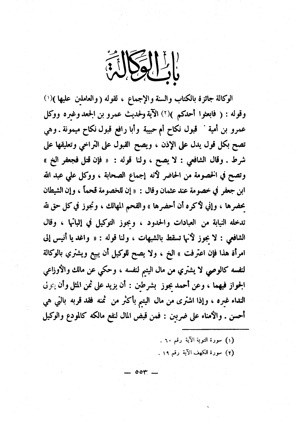 الوكالة جائزة بالكتاب والسنة والإجماع، لقوله {وَالْعَامِلِينَ عَلَيْهَا} ، 1 وقوله: {فَابْعَثُوا أَحَدَكُمْ} الآية، 2ولحديث عمرو بن الجعد وغيره، و"وكل عمرو بن أمية في قبول نكاح أم حبيبة، وأبا رافع قبول نكاح ميمونة".