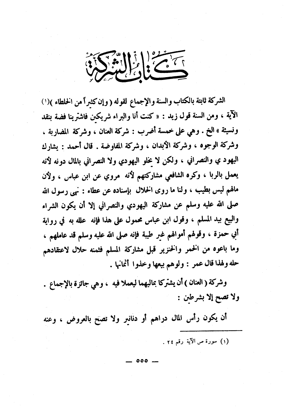 الشركة ثابتة بالكتاب والسنة والإجماع، لقوله {وَإِنَّ كَثِيراً مِنَ الْخُلَطَاءِ} الآية، 1 ومن السنة قول زيد: "كنت أنا والبراء شريكين، فاشترينا فضة بنقد ونسيئة ... إلخ". وهي على خمسة أضرب: شركة العنان، وشركة المضاربة، وشركة الوجوه، وشركة الأبدان، وشركة المفاوضة. قال أحمد يشارك اليهودي والنصراني، ولكن لا يخلو اليهودي ولا النصراني بالمال دونه، لأنه يعمل بالربا. وكره الشافعي مشاركتهم، لأنه مروي عن ابن عباس، ولأن مالهم ليس بطيب. ولنا: ما روى الخلال بإسناده عن عطاء: "نهى رسول الله صلى الله عليه وسلم عن مشاركة اليهودي والنصراني، إلا أن يكون الشراء والبيع بيد المسلم"، وقول ابن عباس محمول على هذا، فإنه علله به في رواية أبي حمزة. وقولهم: أموالهم غير طيبة، فإنه صلى الله عليه وسلم قد عاملهم، وما باعوه من الخمر والخنزير قبل مشاركة المسلم فثمنه حلال لاعتقادهم حله، ولهذا قال عمر: "ولّوهم بيعها وخذوا أثمانها".