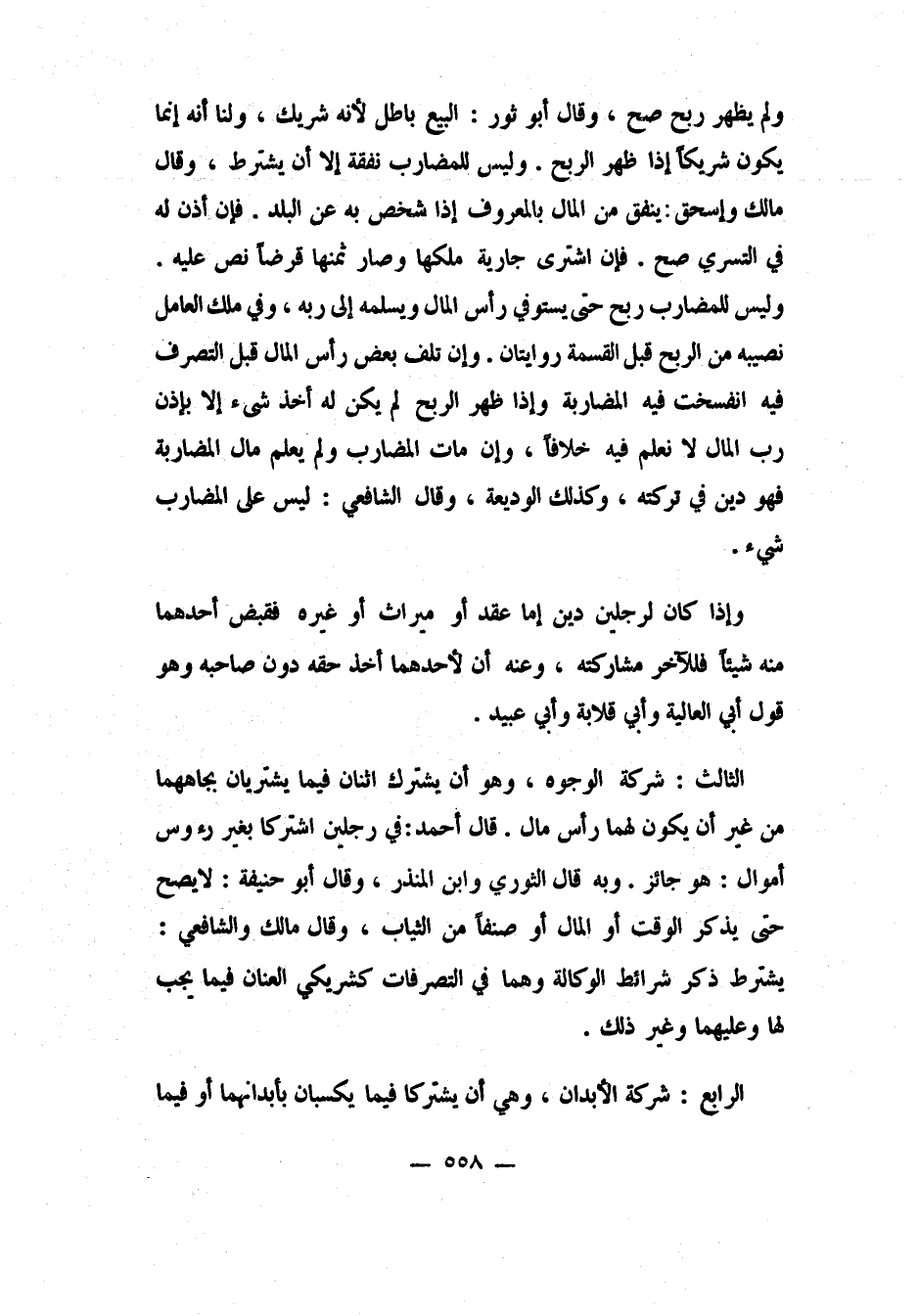 الثالث: (شركة الوجوه) ، وهو أن يشترك اثنان فيما يشتريان بجاههما، من غير أن يكون لهما رأس مال. قال أحمد في رجلين اشتركا بغير رؤوس أموال: هو جائز. وبه قال الثوري وابن المنذر، وقال أبو حنيفة: لا يصح حتى يذكر الوقت أو المال أو صنفاً من الثياب. وقال مالك والشافعي: يشترط ذكر شرائط الوكالة. وهما في التصرفات كشريكي العنان فيما يجب لها وعليهما وغير ذلك.