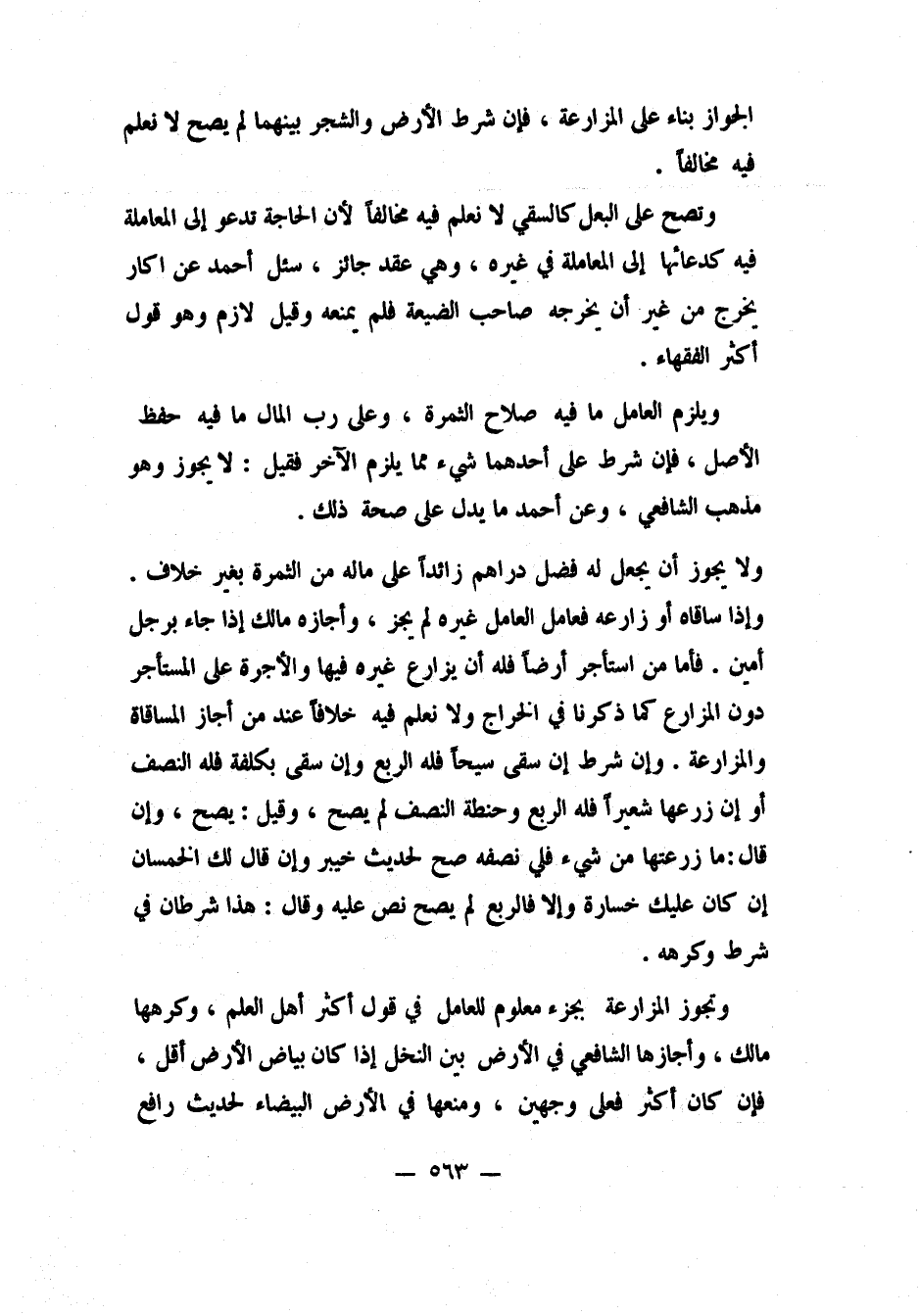 ولا يجوز أن يجعل له فضل دراهم زائداً على ما له من الثمرة، بغير خلاف. وإذا ساقاه أو زارعه فعامل العامل غيره لم يجز، وأجازه مالك، إذا جاء برجل أمين. فأما من استأجر أرضاً فله أن يزارع غيره فيها، والأجرة على المستأجر دون المزارع كما ذكرنا في الخراج، ولا نعلم فيه خلافاً عند من أجاز المساقاة والمزارعة. وإن شرط: إن سقى سيحاً فله الربع، وإن سقى بكلفة فله النصف، أو إن زرعها شعيراً فله الربع، وحنطة النصف، لم يصح، وقيل: يصح. وإن قال: ما زرعتها من شيء فلي نصفه، صح، لحديث خيبر. وإن قال: لك الخمسان إن كان عليك خسارة، وإلا فالربع، لم يصح، نص عليه وقال: هذا شرطان في شرط، وكرِهه.
