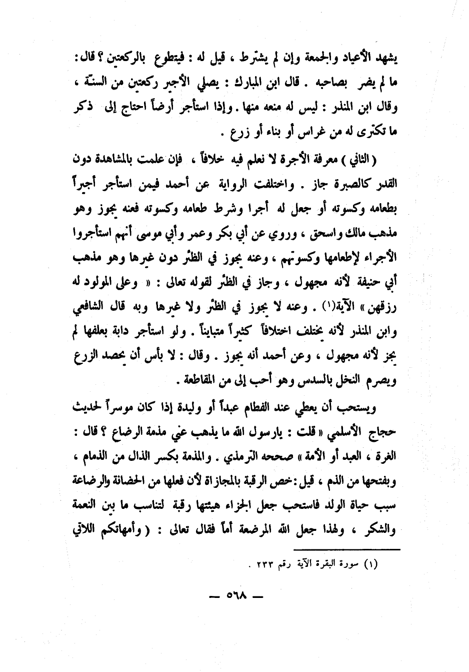 الثاني: معرفة الأجرة، لا نعلم فيه خلافاً، فإن علمت بالمشاهدة دون القدر كالصبرة جاز. واختلفت الرواية عن أحمد: فيمن استأجر أجيراً بطعامه وكسوته، أو جعل له أجراً، وشرط طعامه وكسوته، فعنه: يجوز، وهو مذهب مالك وإسحاق. وروي عن أبي بكر وعمر وأبي موسى "أنهم استأجروا الأجراء لإطعامهم وكسوتهم". وعنه: يجوز في الظئر دون غيرها، وهو مذهب أبي حنيفة لأنه مجهول. وجاز في الظئر، لقوله تعالى: {وَعَلَى الْمَوْلُودِ لَهُ رِزْقُهُنَّ} الآية. 1 وعنه: لا يجوز في الظئر ولا غيرها، وبه قال الشافعي وابن المنذر، لأنه يختلف اختلافاً كثيراً متبايناً. ولو استأجر دابة بعلفها لم يجز لأنه مجهول، وعن أحمد: أنه يجوز. وقال: لا بأس أن يحصد الزرع ويصرم النخل بالسدس، وهو أحب إلي من المقاطعة. ويستحب أن يعطي عند الفطام عبداً أو وليدة إذا كان موسراً، لحديث حجاج الأسلمي: "قلت: يا رسول الله، ما يذهب عني مذمّة الرضاع؟ قال: الغرة، العبد أو الأمة". 2 صححه الترمذي. والمذمة بكسر الذال من الذِمام، وبفتحها من الذَّم. قيل: خص الرقبة بالمجازاة، لأن فعلها من الحضانة والرضاعة سبب حياة الولد، فاستحب جعل الجزاء هيئتها رقبة لتناسب ما بين النعمة والشكر، ولهذا جعل الله المرضعة أماً، فقال تعالى: {وَأُمَّهَاتُكُمُ اللاَّتِي} ، 3
